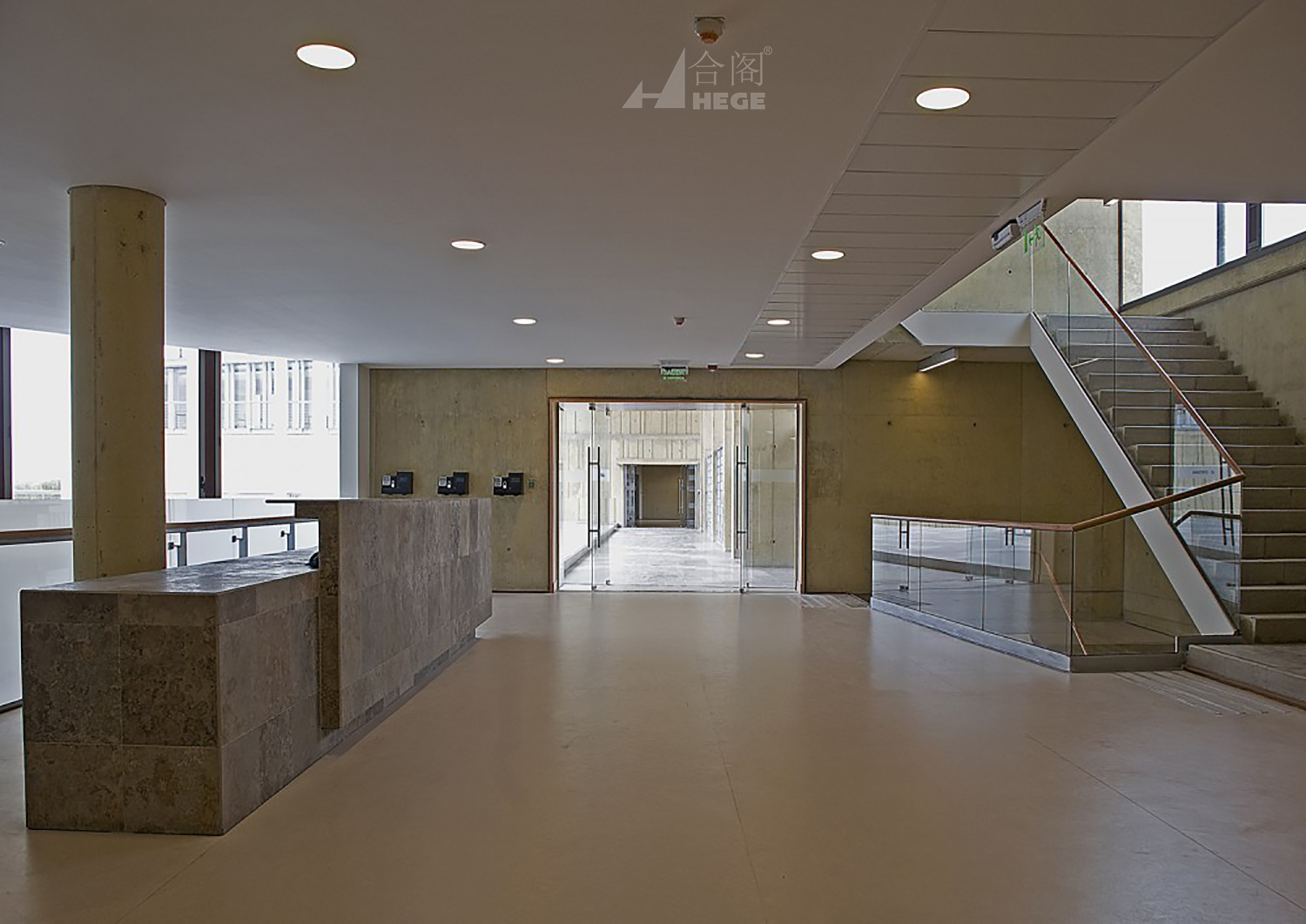 建筑面向在城市与河流间的落客区分成了几个体块,并在其间形成了开放的露台。这些露台将河滨景观引入建筑,恢复了老城的视廊。两栋核心建筑被与街道平面连接的部分拱卫着。东部的体块包含大礼堂、多功能厅及在二层的餐厅。餐厅与一个开放的观景平台相连。大礼堂占用两层,因而可以从外部通过上层进入,也可以从内部的下层进入。