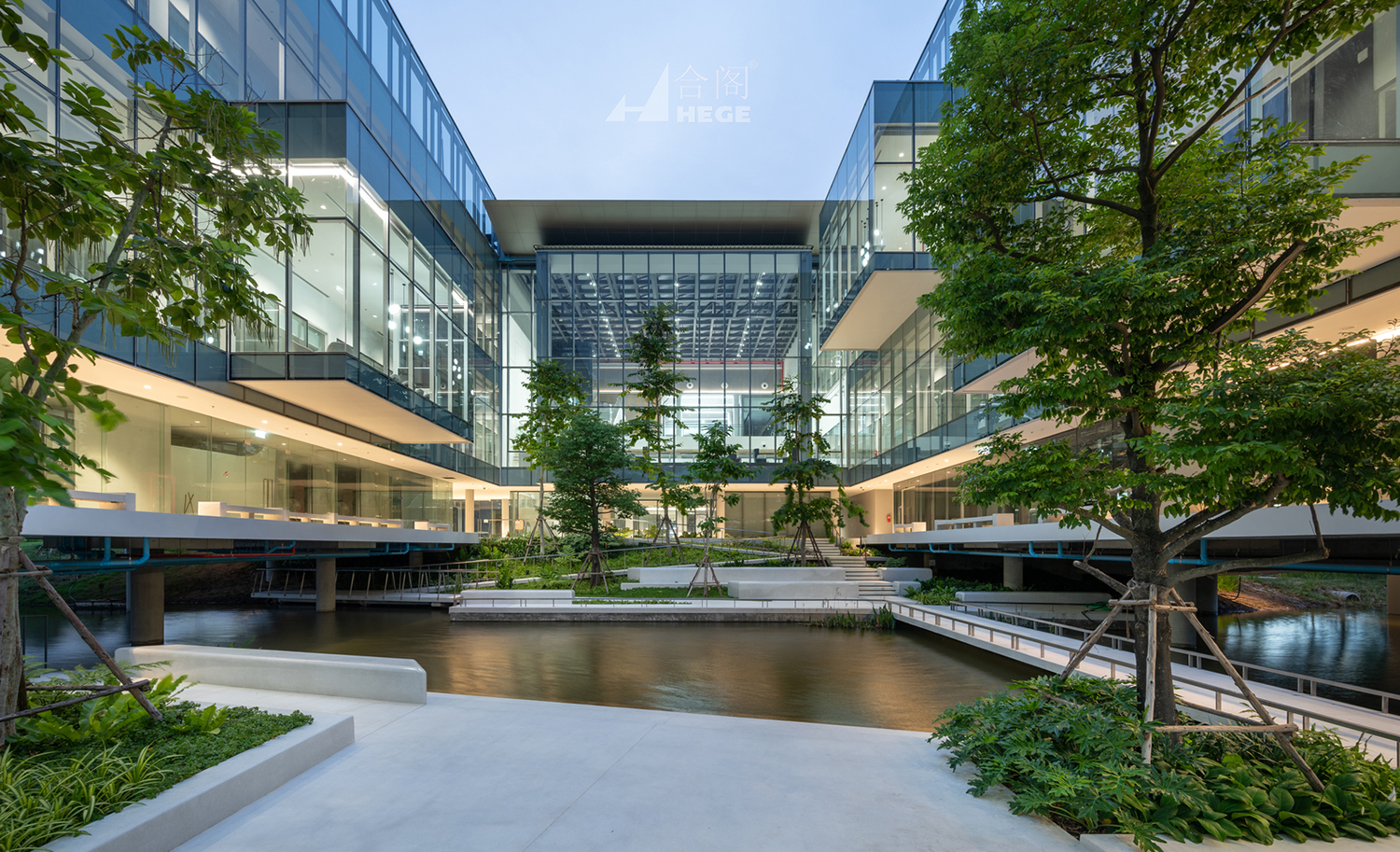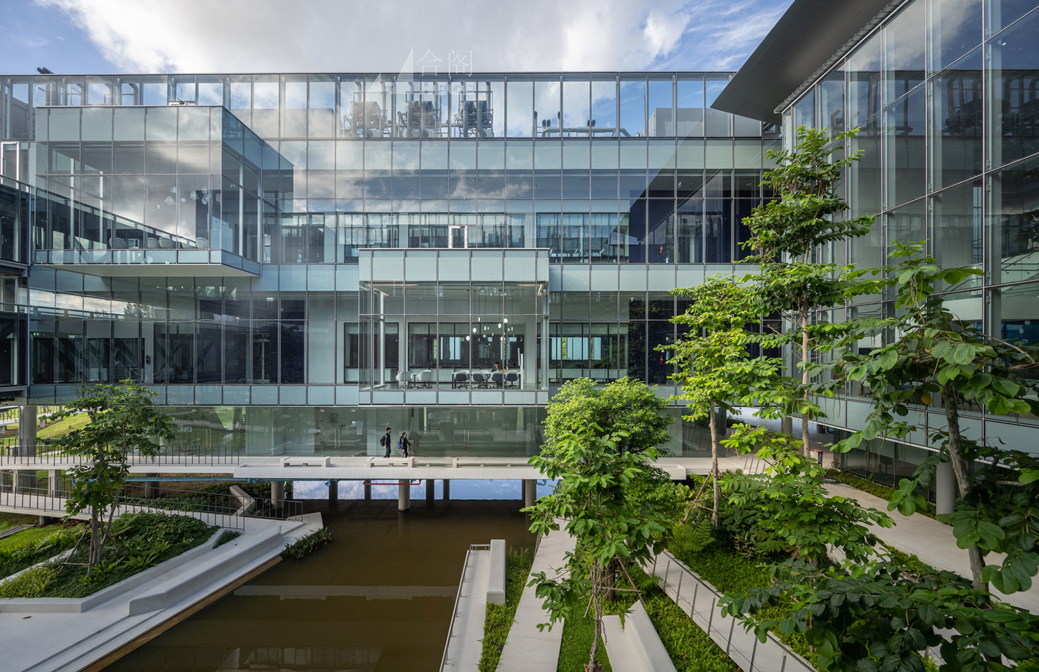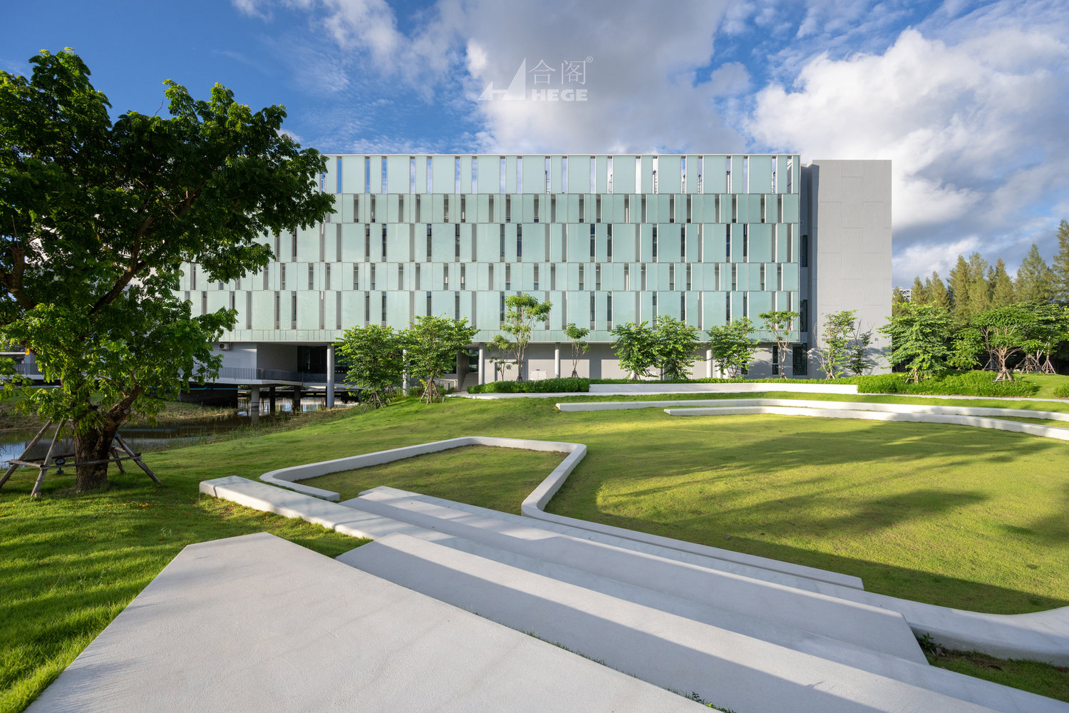 建筑主要的玻璃幕墙也朝南设置,透过幕墙可欣赏到IRPC园区的美景。在建筑结构上使用了大跨度的结构以支撑整个空间,并且形成了连接两个侧楼的桥梁。这座桥同时还起到将沟通两个建筑的机械和电气系统遮盖起来的作用。
