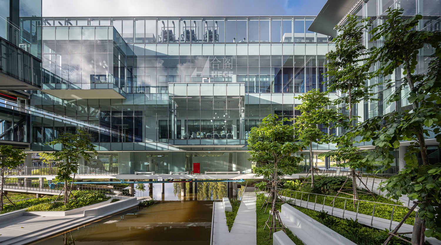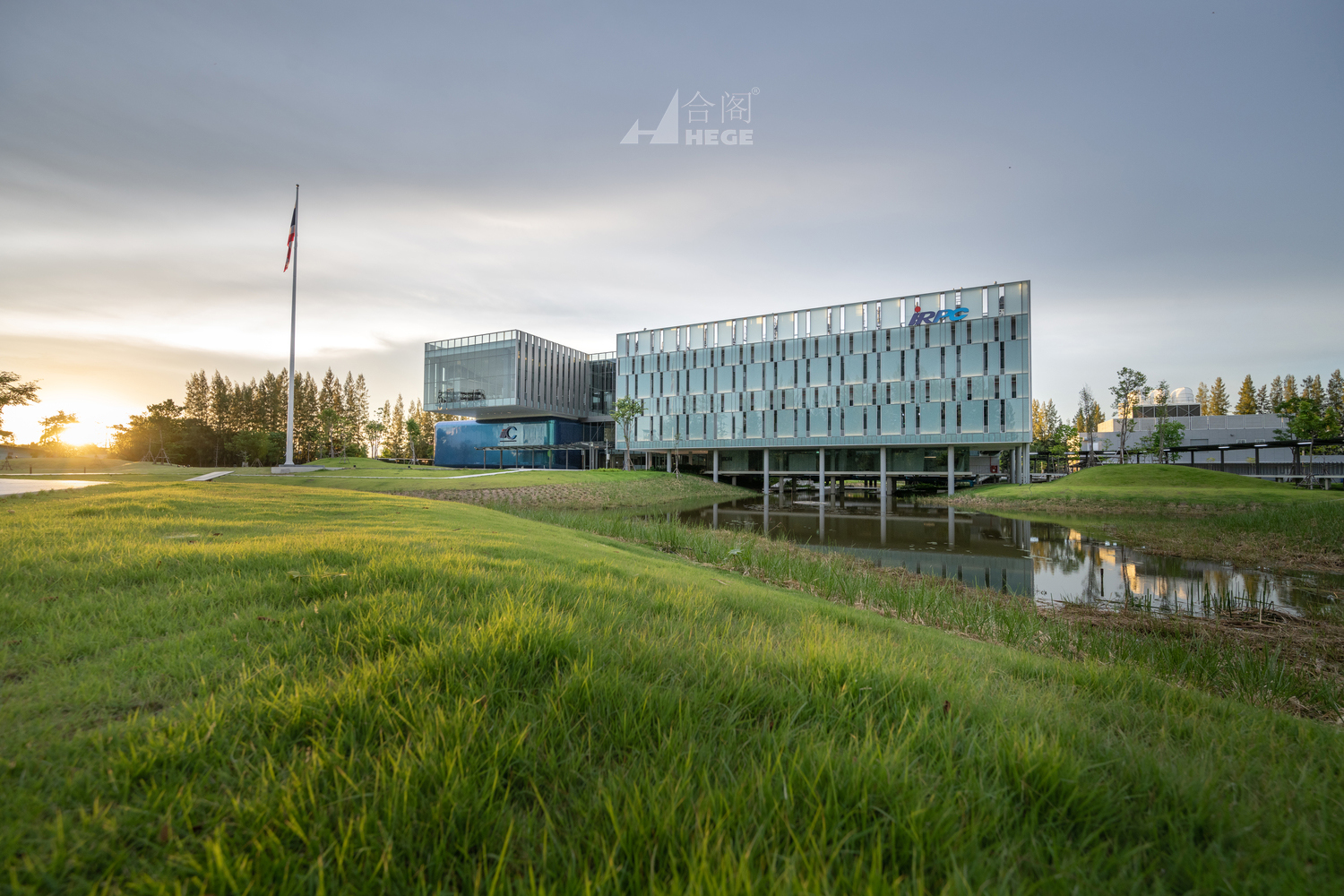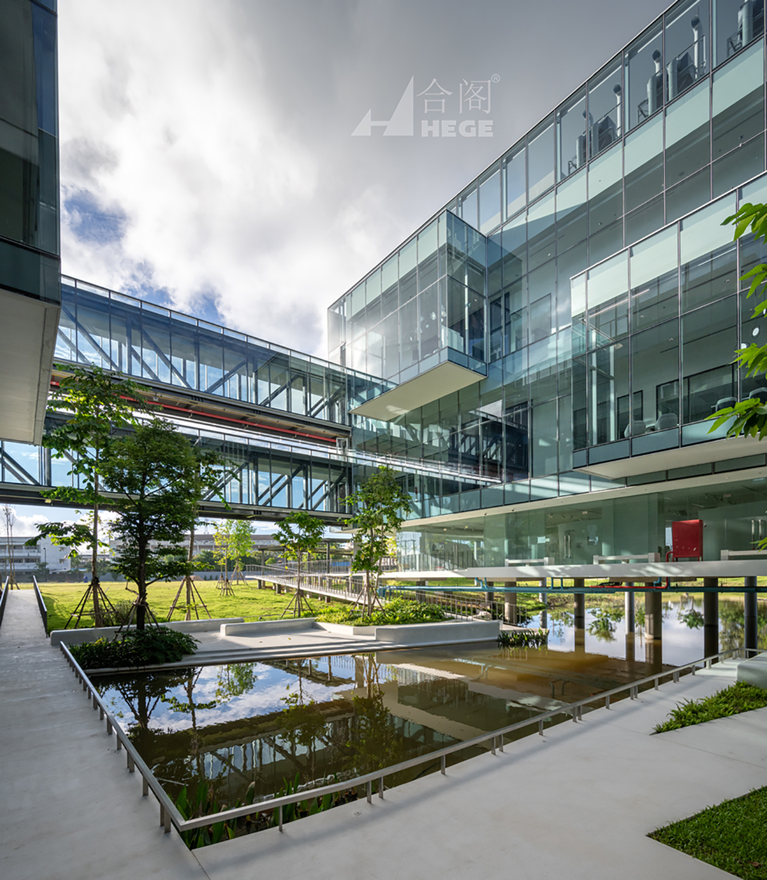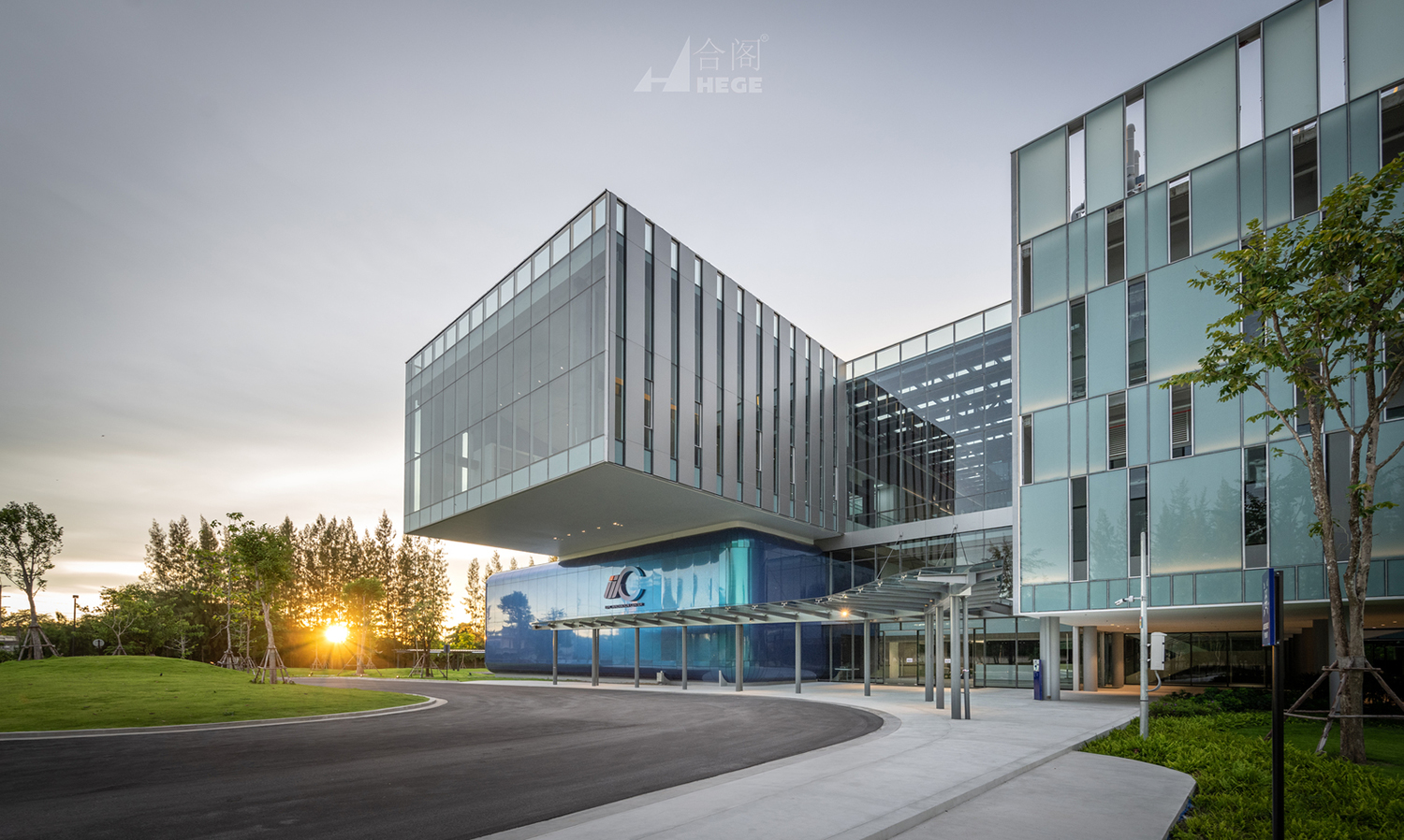 建筑主要的玻璃幕墙也朝南设置,透过幕墙可欣赏到IRPC园区的美景。在建筑结构上使用了大跨度的结构以支撑整个空间,并且形成了连接两个侧楼的桥梁。这座桥同时还起到将沟通两个建筑的机械和电气系统遮盖起来的作用。