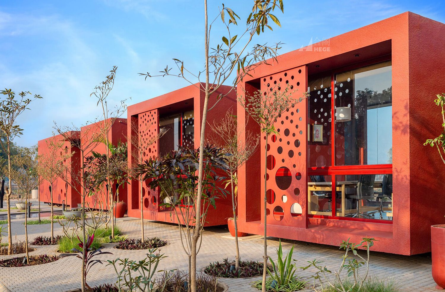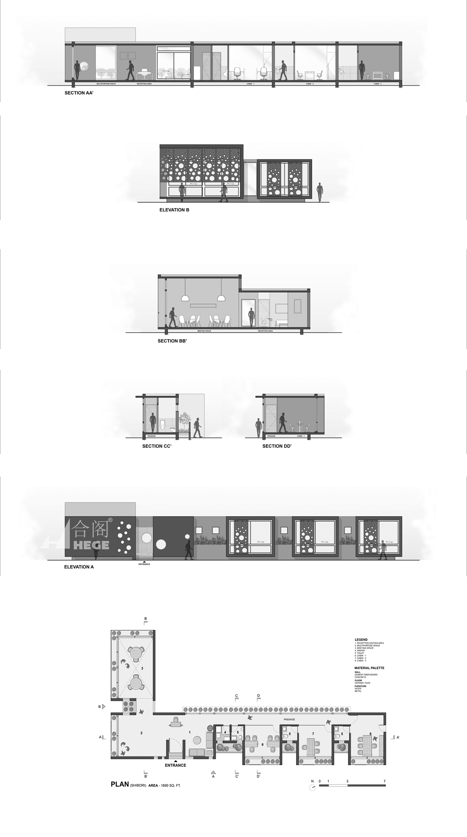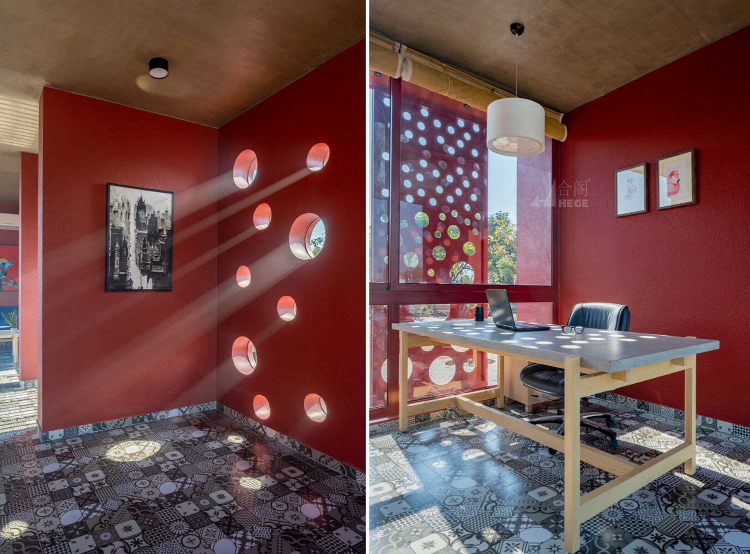 空间是一个简单的L形,在两臂的交界处有一个多用途的房间。一部分用于接待/等候区和一系列的小木屋,而另一部分则是会议室。小块的庭院扮演着统一空间和缓冲空间的双重角色。这些也会对室内空气质量产生积极影响,从而影响使用者的健康。l形办公室的基座被抬高了1.5英尺,创造了一种漂浮的效果。面向道路的立面被圆形切割的遮阳板遮挡,以保护人们免受刺眼的西南阳光的照射。这种柔和的自然光使空间看起来不那么狭窄,并带来活力、能量和生产力。