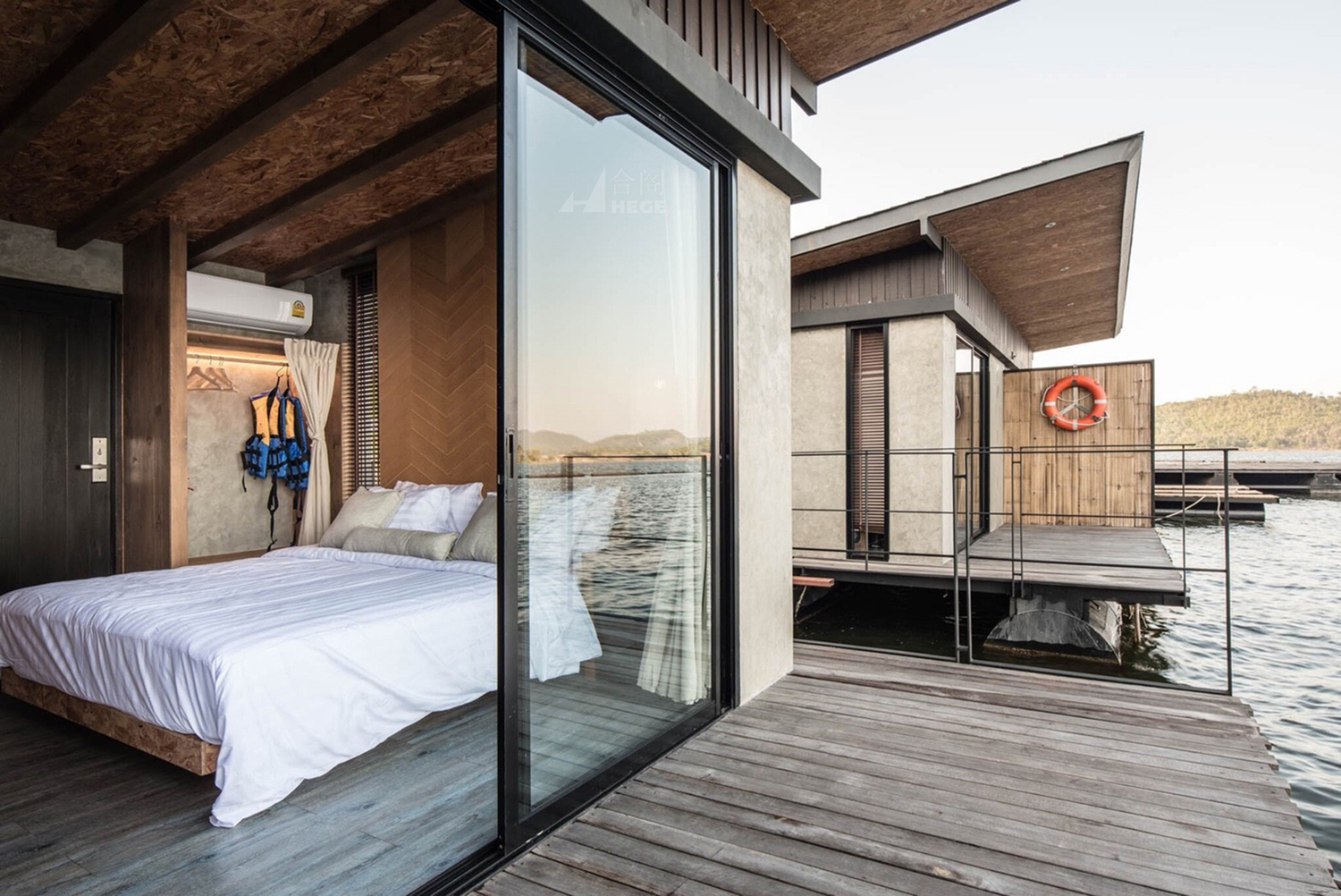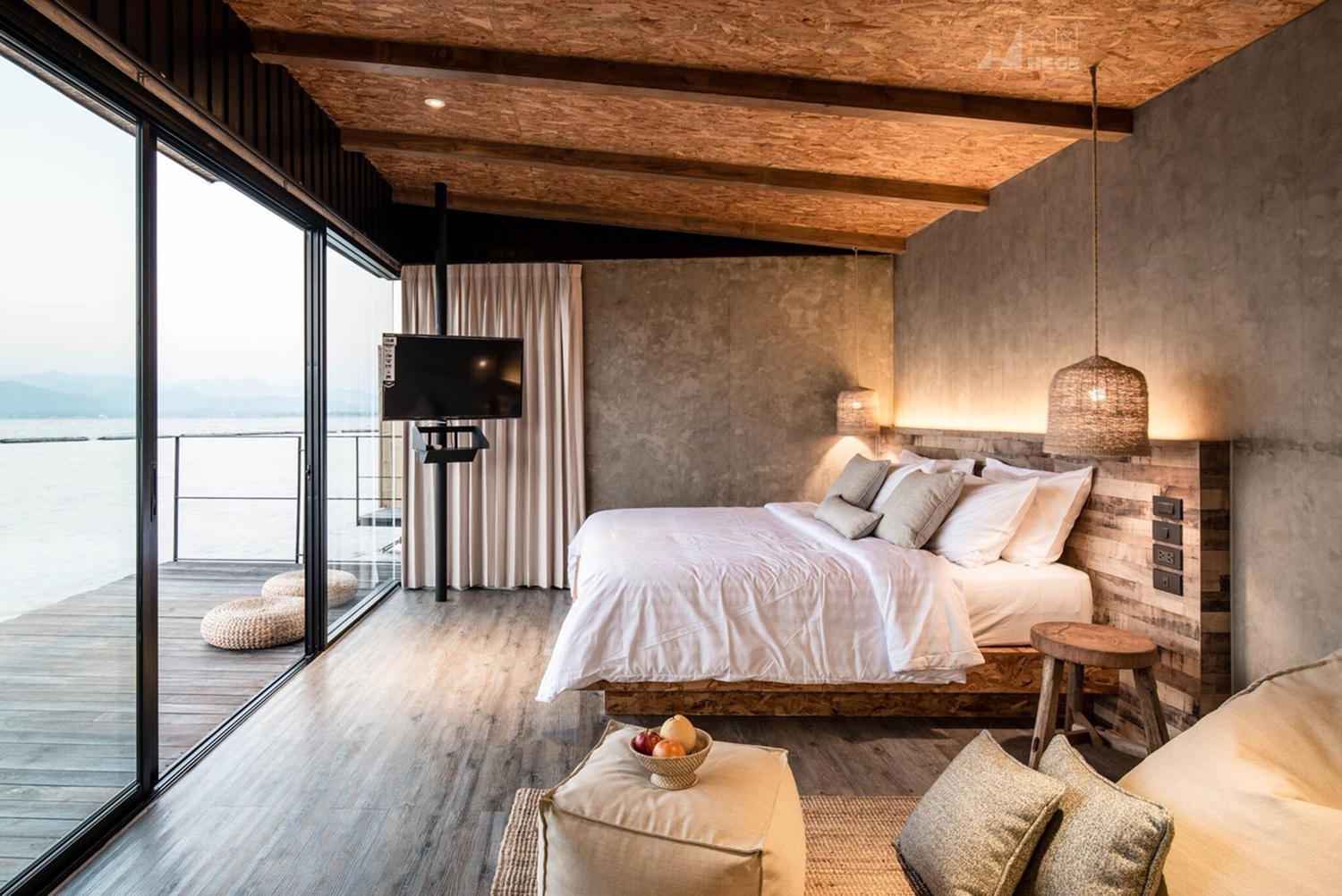 该度假酒店是一个漂浮度假胜地,以自然为导向,提供私人陆上住宿和舒适的漂流住宿。每个建筑都利用自然通风,形状和颜色与山景和湖景的吸引力紧密地融合在一起。比例也符合环境。线条明显地代表了湖滨的自然文脉,大堂设计基于月亮的方向,这意味着度假村的猜测可以享受令人惊叹的“日出和日落”的风景。