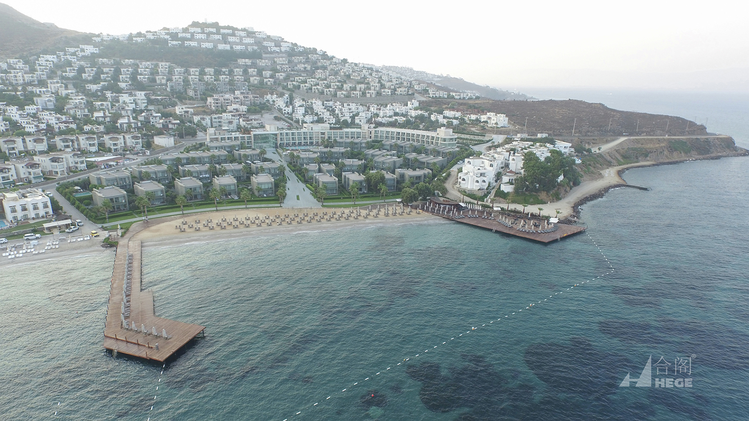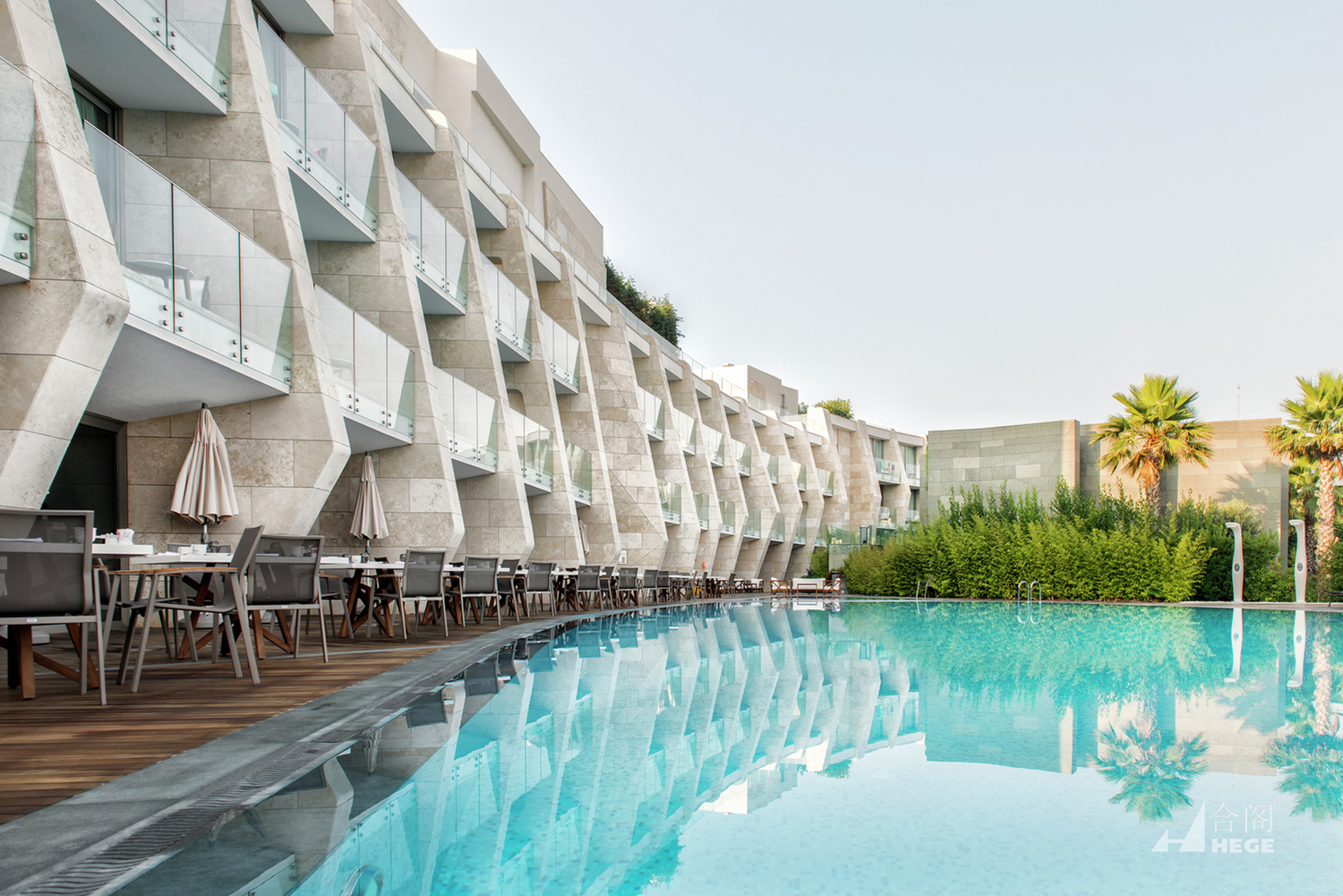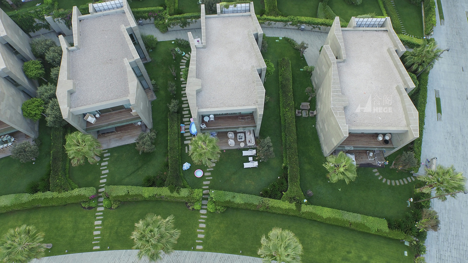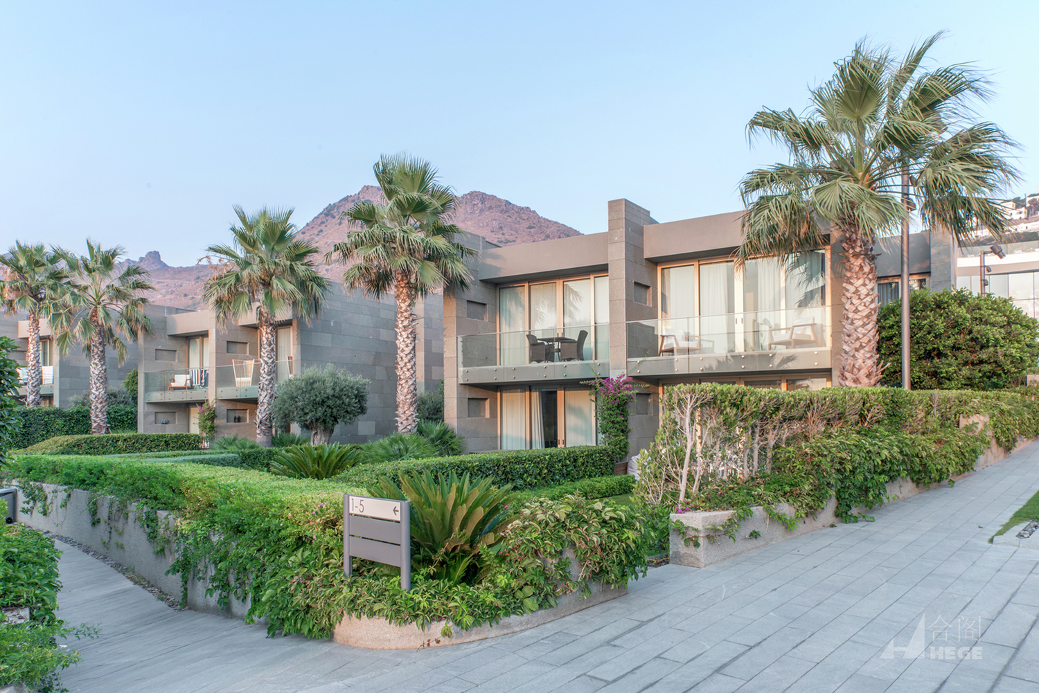 酒店是一个海滩开发项目。该项目作为酒店可以容纳60个房间、46个公寓以及27个居住别墅,并且包含了spa、健身房和泳池等设施。酒店具有扭转的结构,位于场地的最高点,作为了开发的门面。一条人行道从酒店的大堂直达海边,桥状的悬浮空间末端具有海景餐厅和酒吧,可以直面大海。这一主轴线成为了场地交通的脊椎。公寓和别墅被设计在一系列平台上,沿海瀑布般展开,提供了最大的可能视野。每一个别墅在上层是私密的卧室,下层是巨大的起居室以及花园,围墙退到建筑的一边,为每一座别墅提供了海景。幕墙为建筑增添了另一层的细节,并且可以遮挡夏日的阳光。
