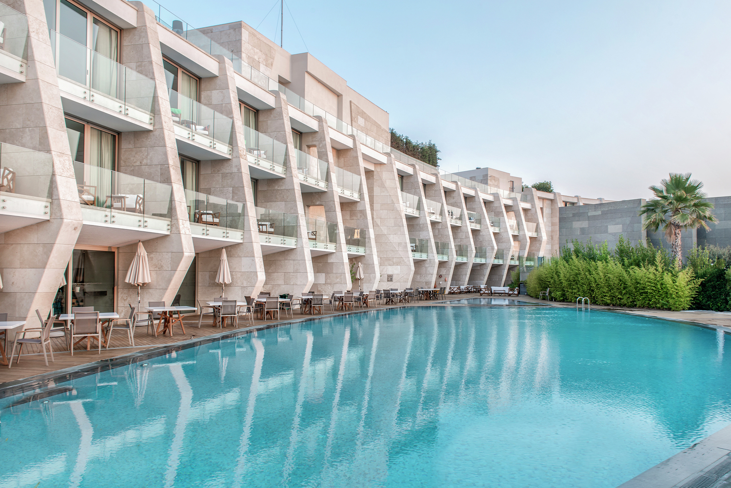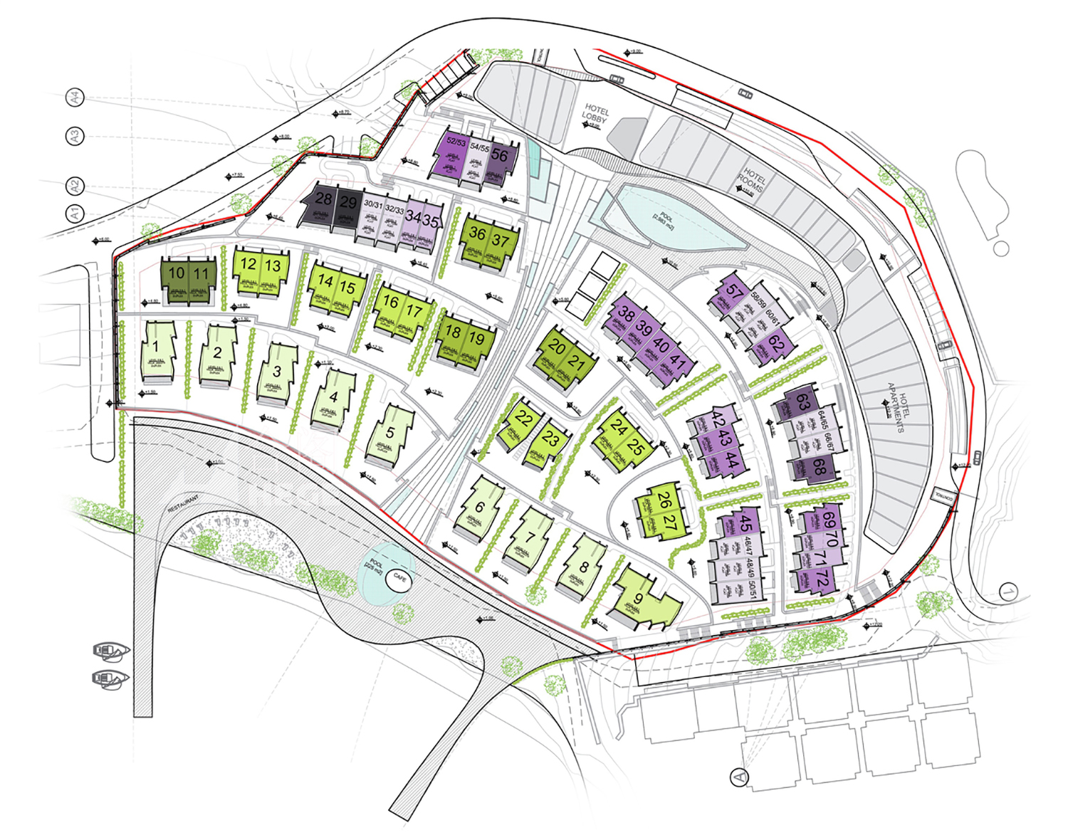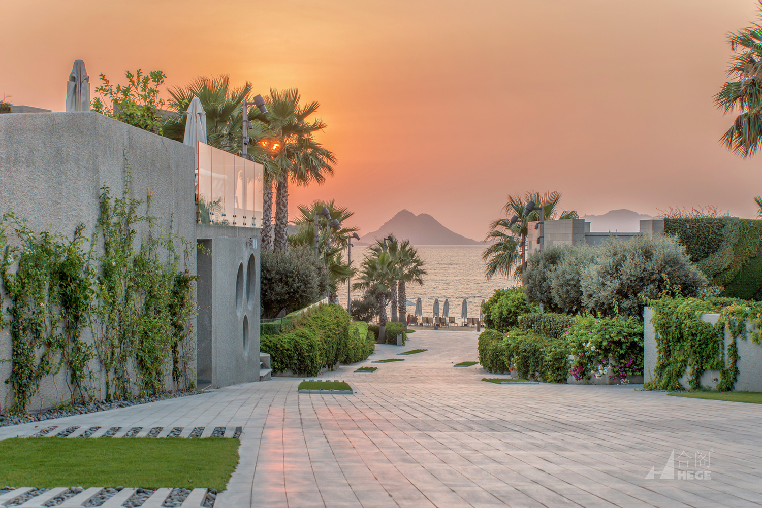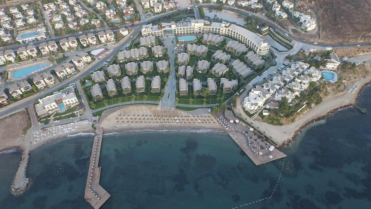酒店是一个海滩开发项目。该项目作为酒店可以容纳60个房间、46个公寓以及27个居住别墅,并且包含了spa、健身房和泳池等设施。酒店具有扭转的结构,位于场地的最高点,作为了开发的门面。一条人行道从酒店的大堂直达海边,桥状的悬浮空间末端具有海景餐厅和酒吧,可以直面大海。这一主轴线成为了场地交通的脊椎。公寓和别墅被设计在一系列平台上,沿海瀑布般展开,提供了最大的可能视野。每一个别墅在上层是私密的卧室,下层是巨大的起居室以及花园,围墙退到建筑的一边,为每一座别墅提供了海景。幕墙为建筑增添了另一层的细节,并且可以遮挡夏日的阳光。