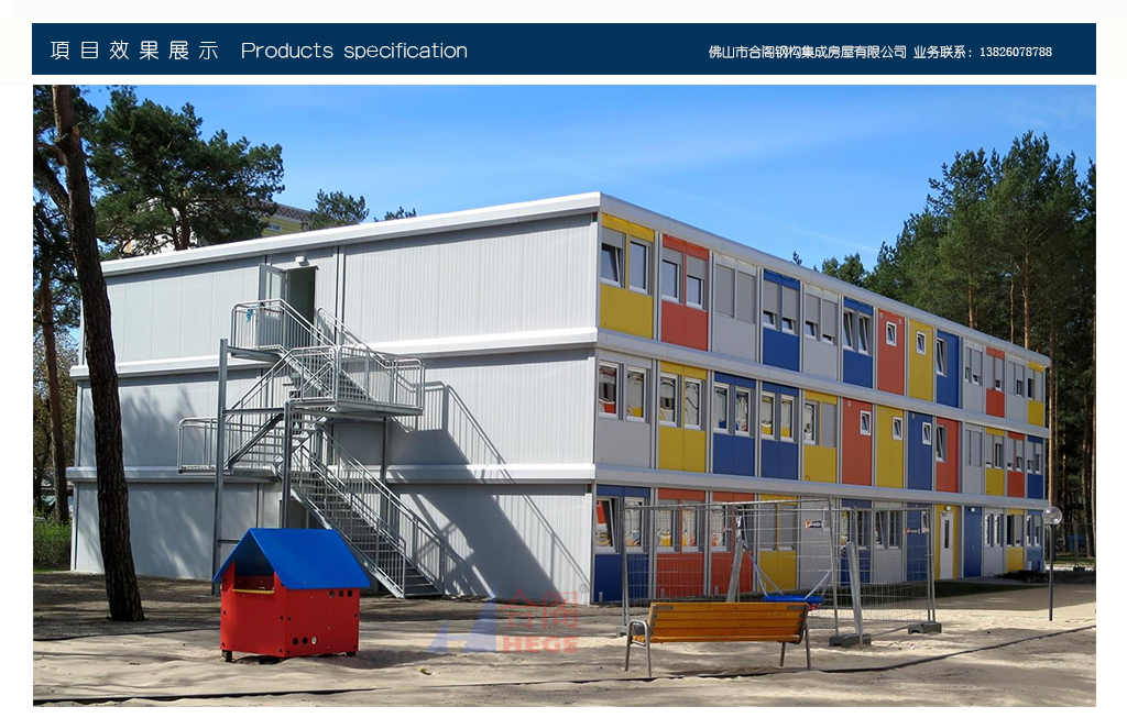 五、拆装方便,性能优越,稳定牢固,防震性能好,防水防火防腐,重量轻。房屋为整体结构,内有框架,墙体为钢板,可用木板饰面,可整体迁移,使用寿命可达20年以上。