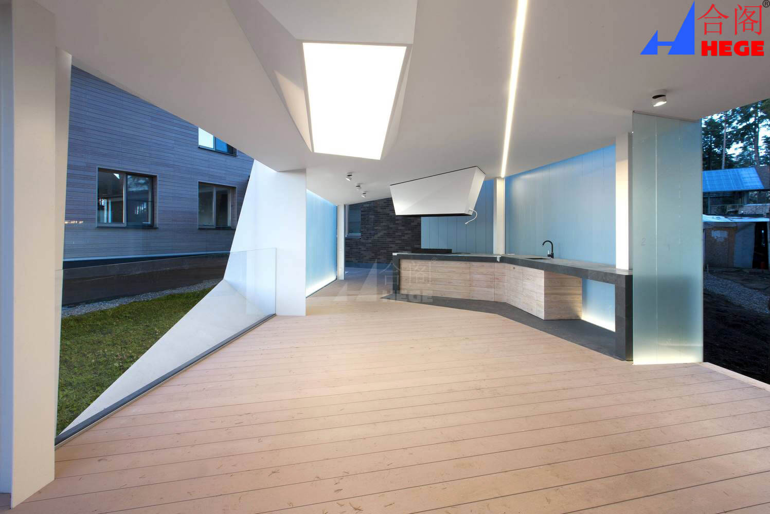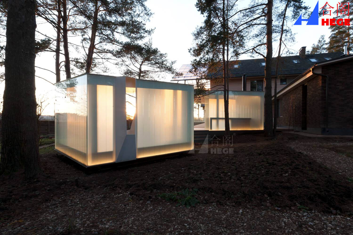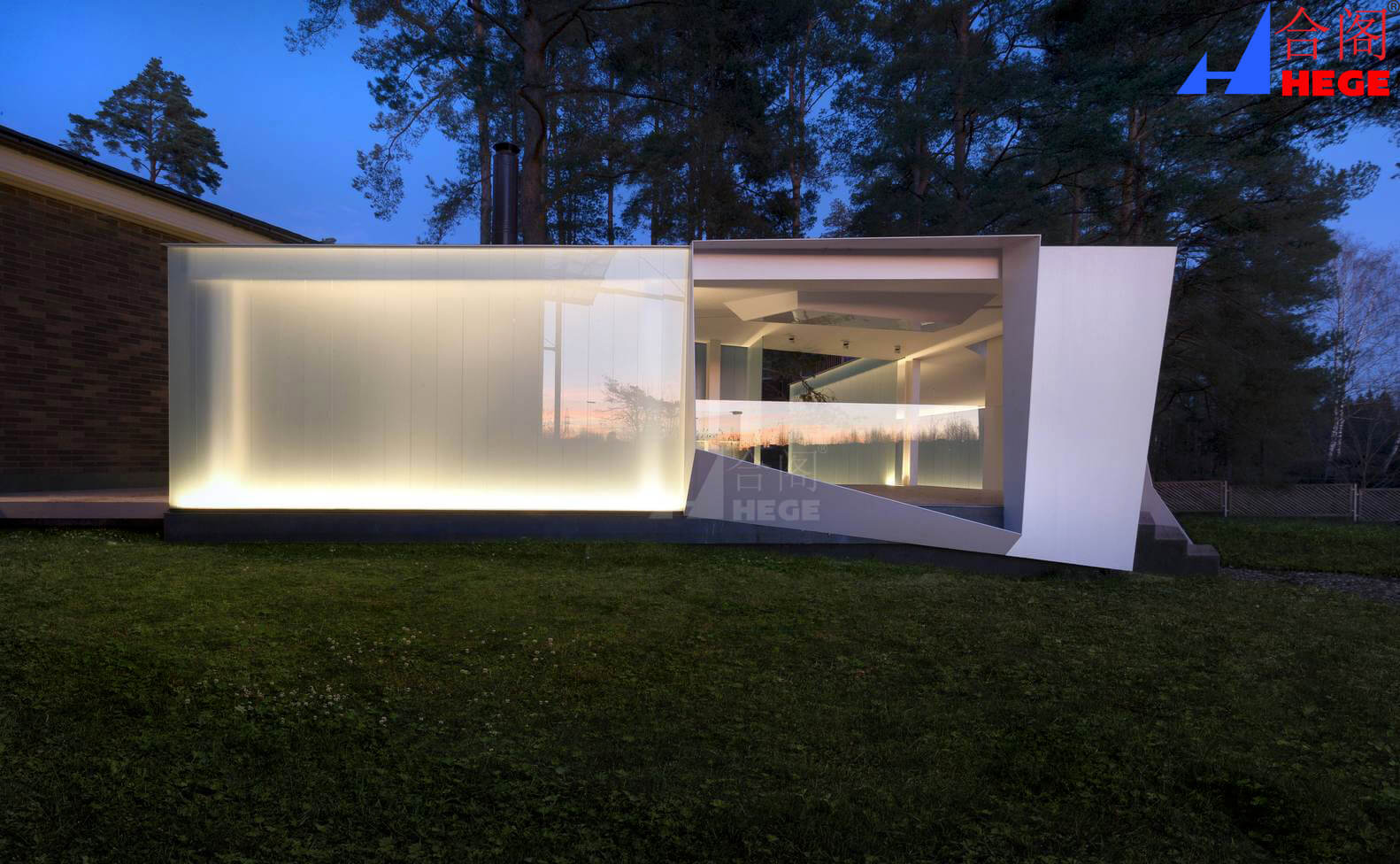 尽管整个内部空间显得很简单,但是这个设计的首要目的是为了长期使用。地基是打桩式的钢筋厚板,加上一个金属边框和预制板屋顶。露台的墙体是由玻璃制成,上面覆盖了一层磨砂质地的薄膜。复杂的几何元素则由喷漆的金属薄片制成。在黑夜里,由于周边的LED灯,这个建筑可以营造出一种非常特别的感觉。神秘的光晕投射在古树之间,露台看起来非常迷人,仿若一个飞翔的茶碟,抑或是一个中国式灯笼。