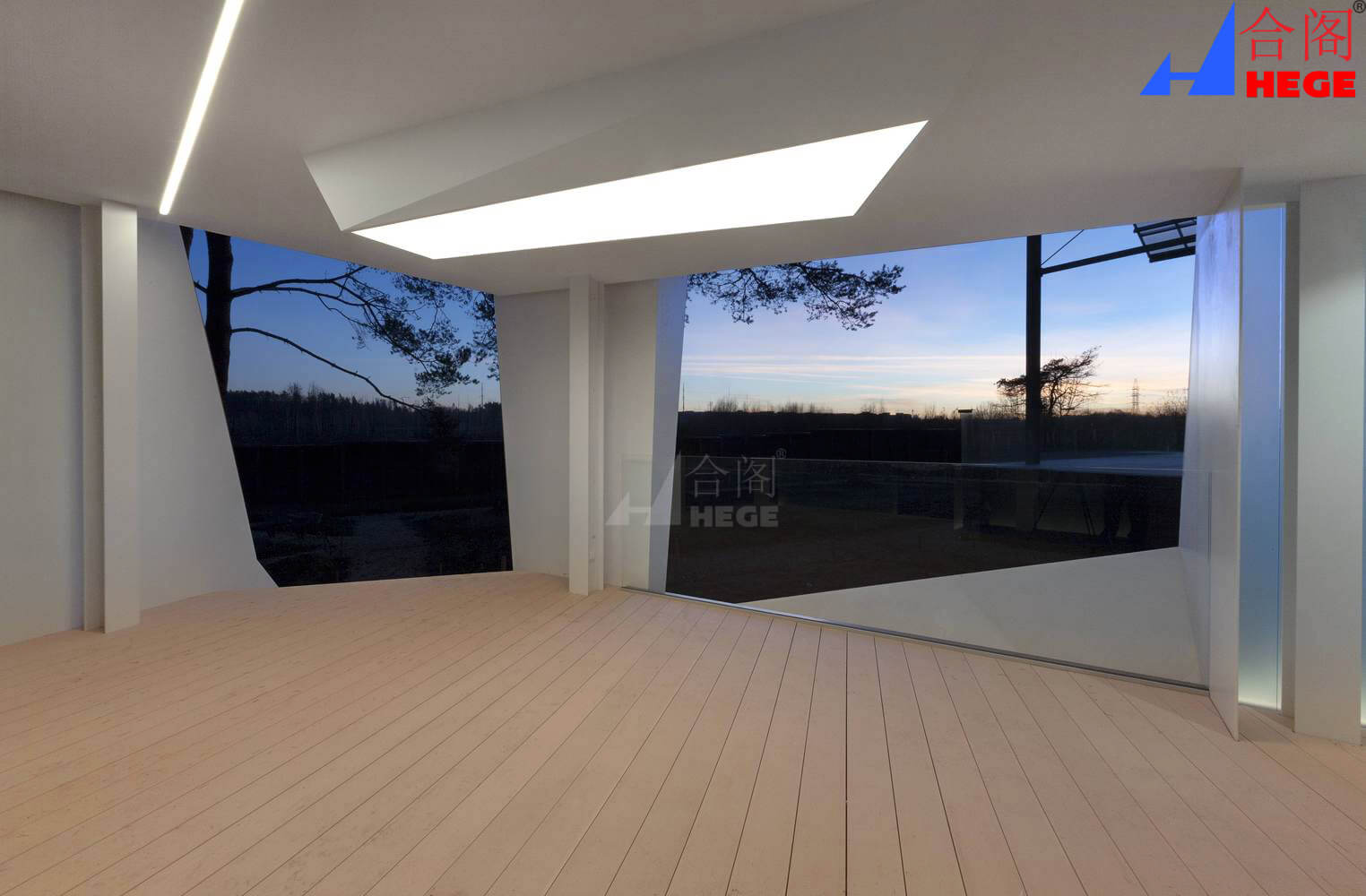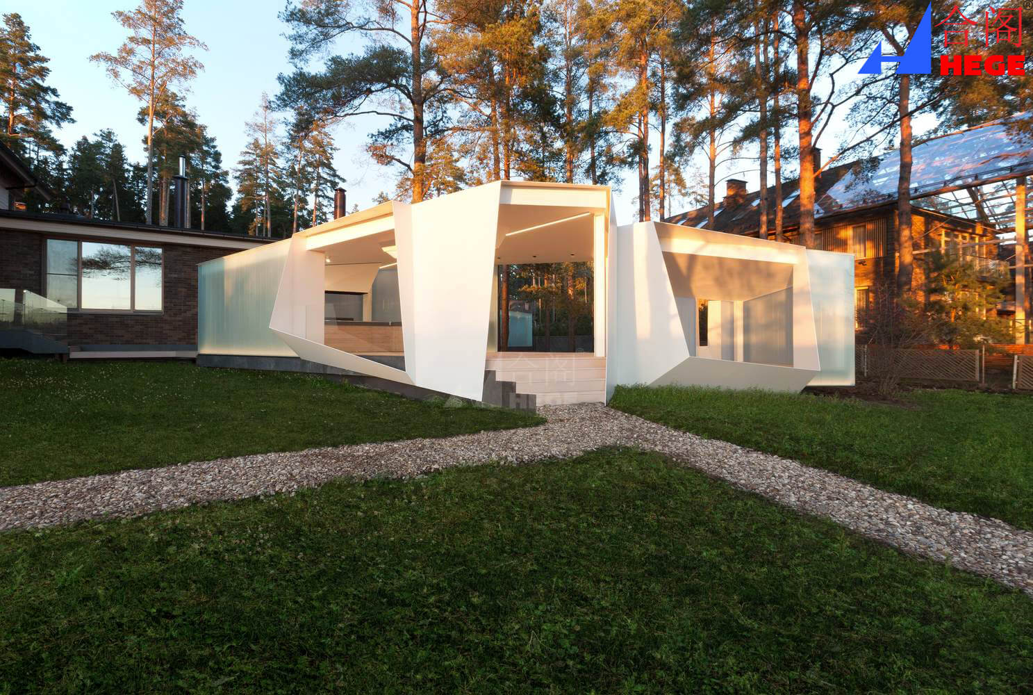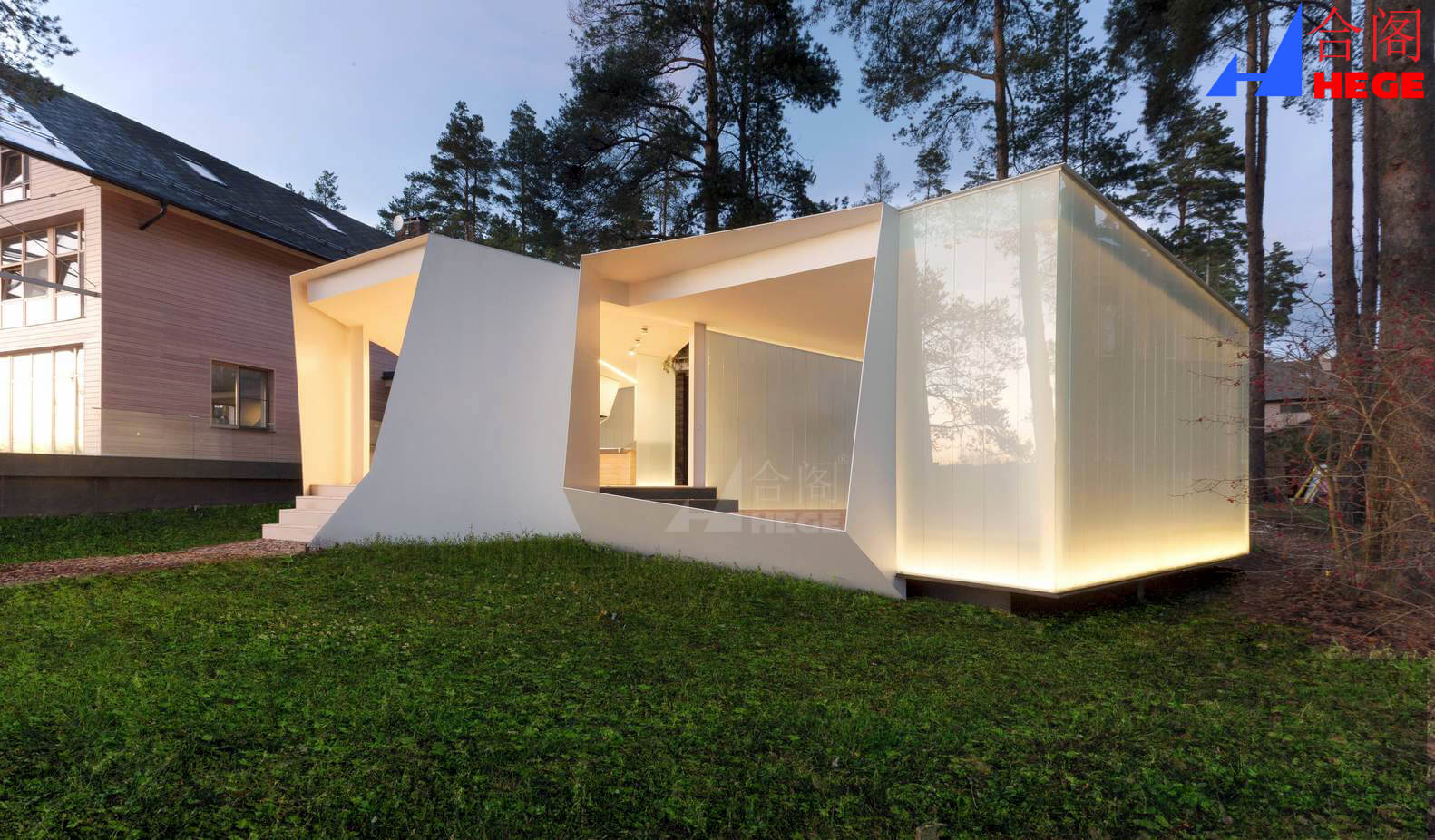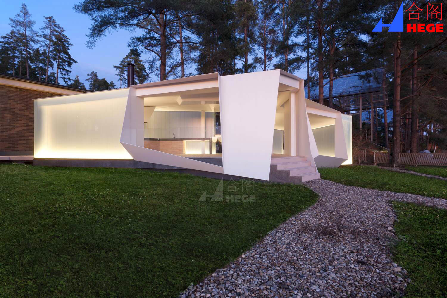 尽管整个内部空间显得很简单,但是这个设计的首要目的是为了长期使用。地基是打桩式的钢筋厚板,加上一个金属边框和预制板屋顶。露台的墙体是由玻璃制成,上面覆盖了一层磨砂质地的薄膜。复杂的几何元素则由喷漆的金属薄片制成。在黑夜里,由于周边的LED灯,这个建筑可以营造出一种非常特别的感觉。神秘的光晕投射在古树之间,露台看起来非常迷人,仿若一个飞翔的茶碟,抑或是一个中国式灯笼。