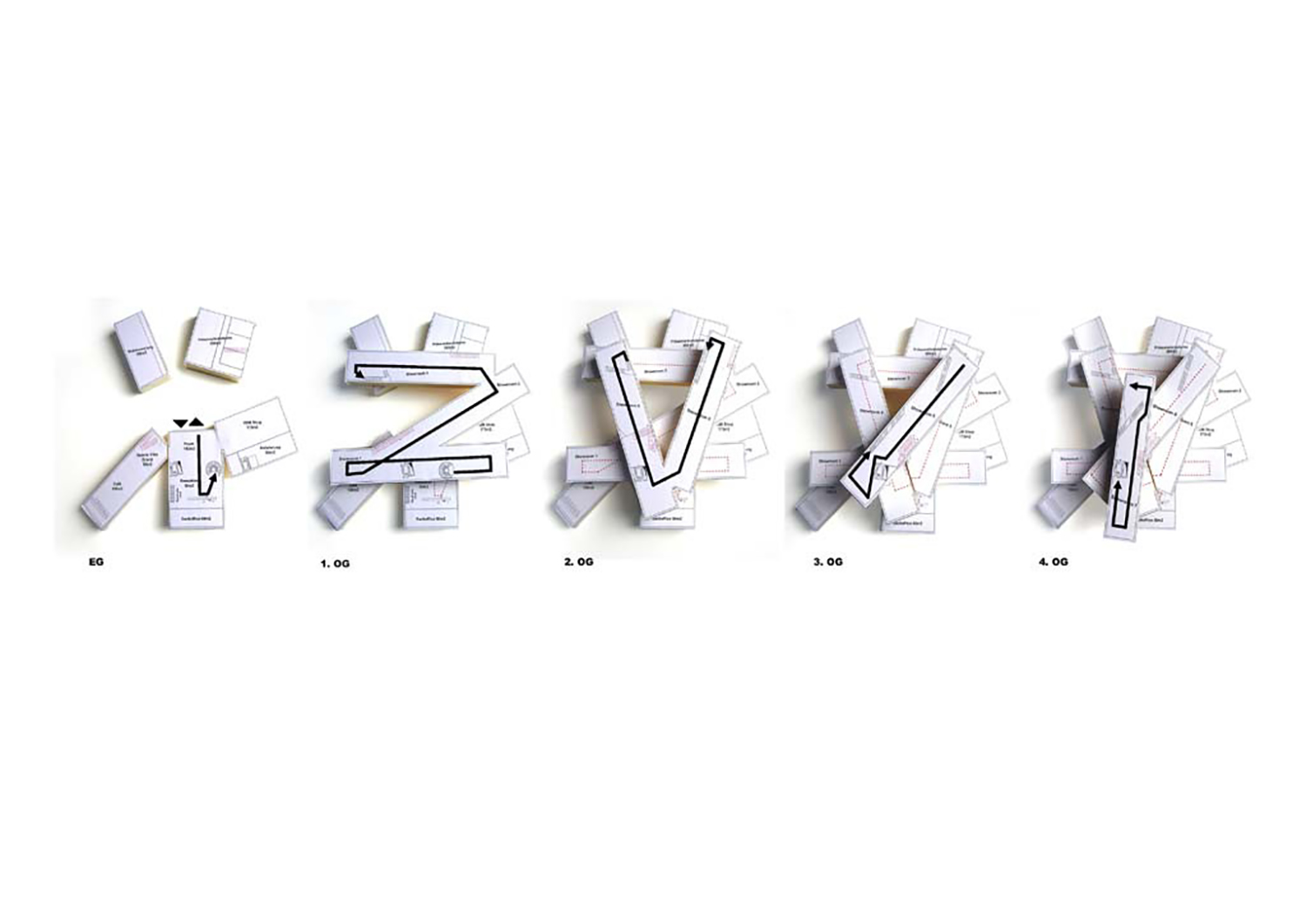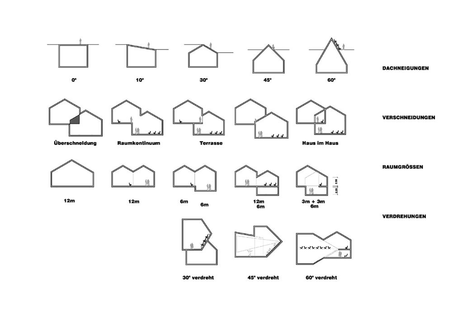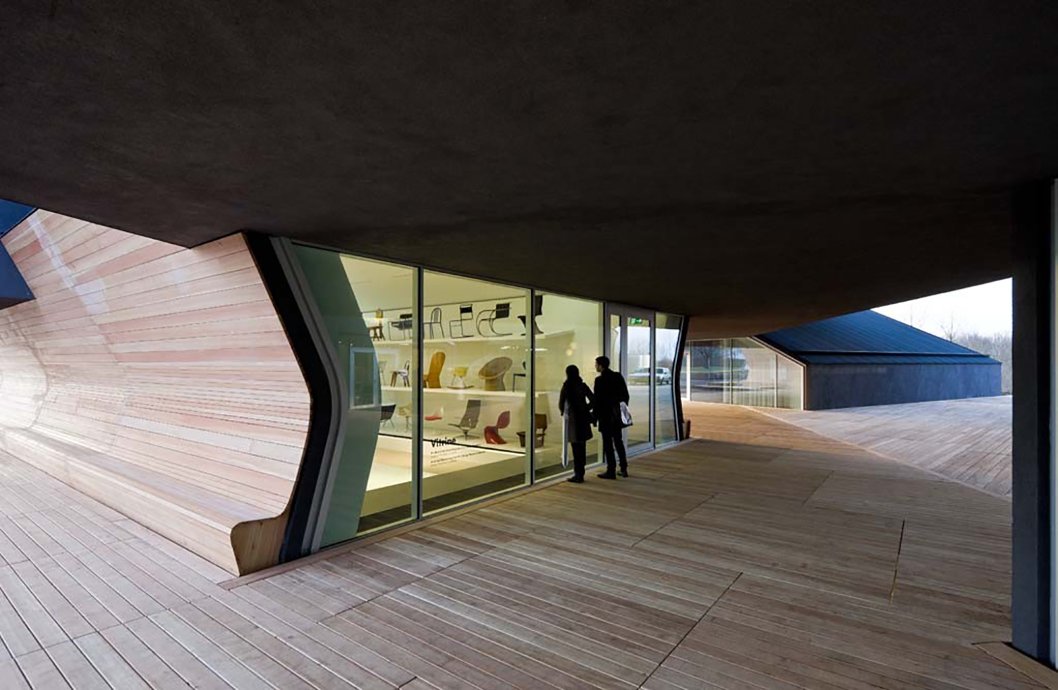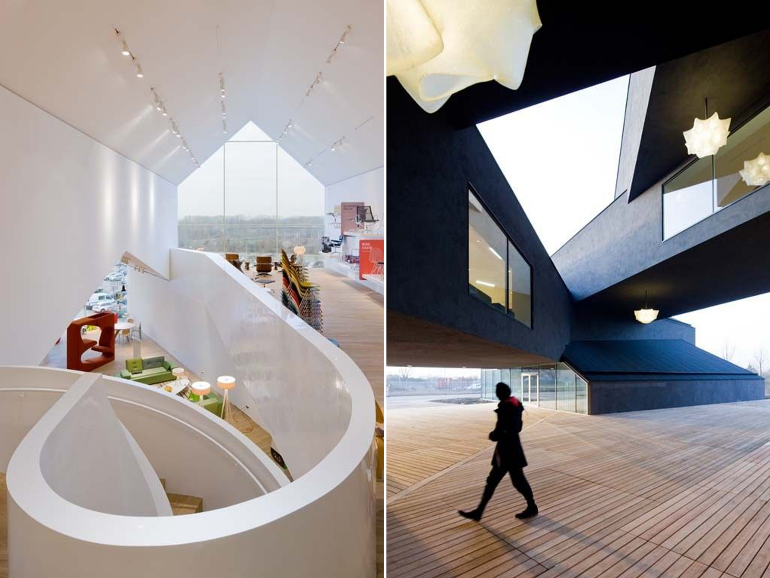 - 这12座房屋总共有五层楼高,有些地方的悬臂高达15米。它们的楼板与下方的山墙相交,形成了一个三维的组合。内部空间的复杂性不仅仅来自于每个房屋之间互成角度的相交,还有第二层的几何概念的整合。 所有的楼梯都被整合到了宽阔的、蜿蜒的、有机的体量当中,像是蠕虫一样在建筑的各个层面上穿行,有时在不同的房屋之间显示出迷人的视觉关系,但有时也会遮挡视线。室内的墙壁最终被做成了白色,以便将家具的展示放在主要位置。到了晚上,视角就颠倒了。在白天,游客可以从内部眺望外面的风景,但当夜幕降临时,灯光照明的建筑内部会从内开始发光,同时它的物理建筑结构看起来像是消失了一般。房间都被打开,玻璃山墙尽端变成了展示箱的窗口,将周边的乡村照亮。
