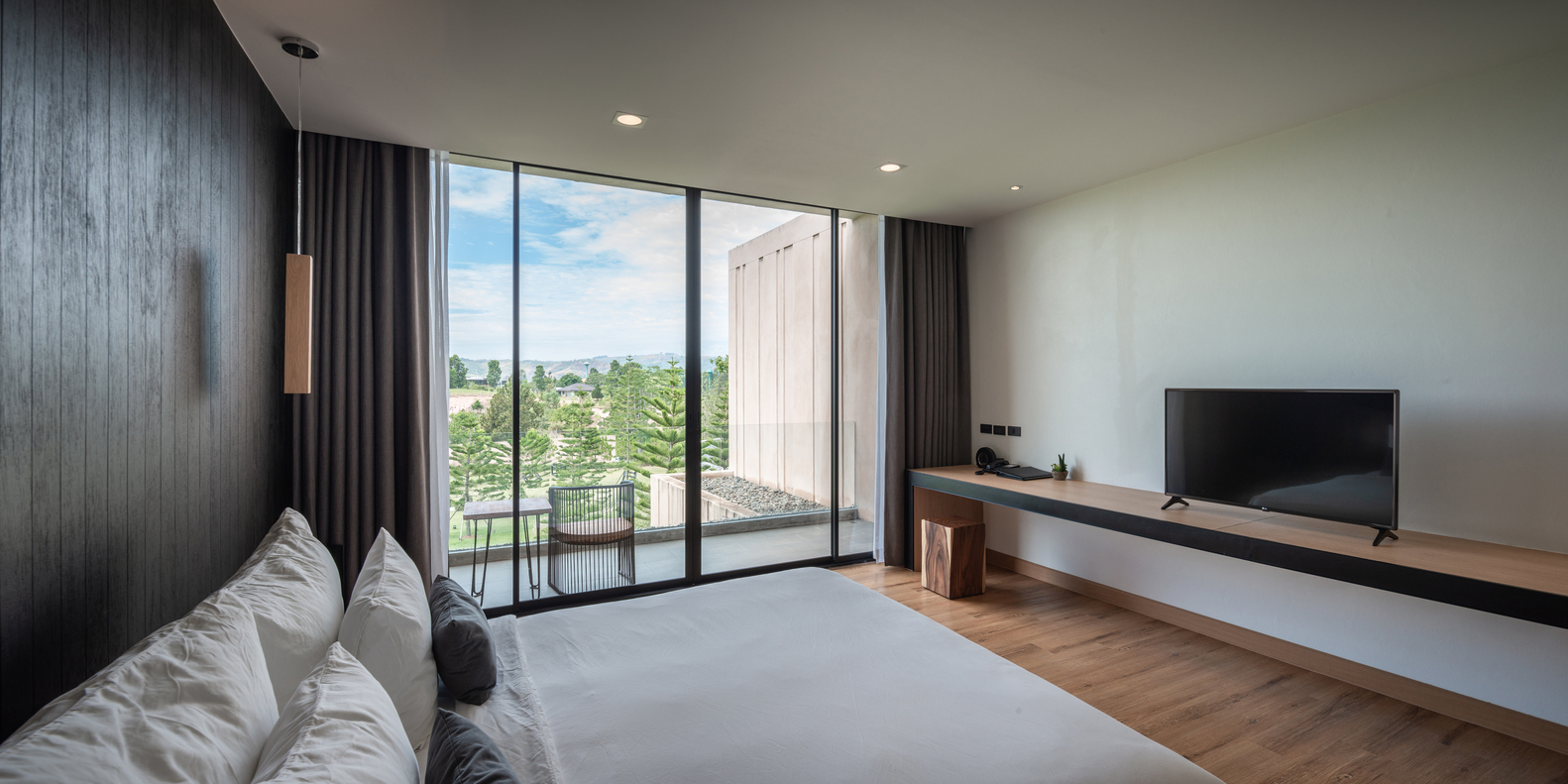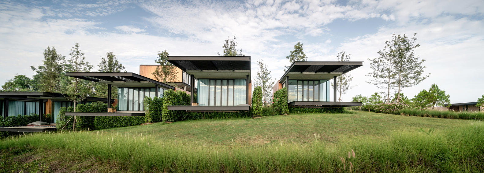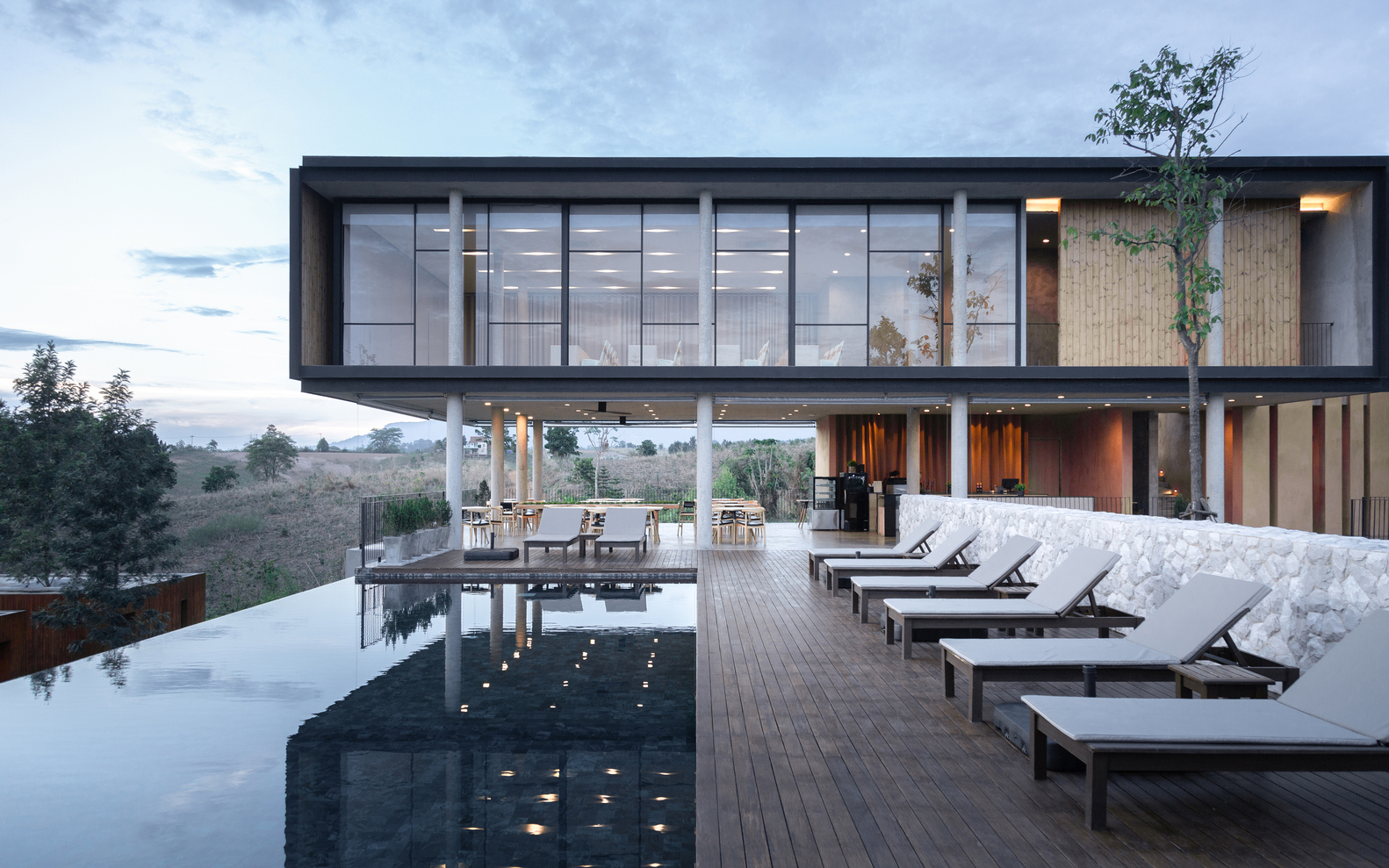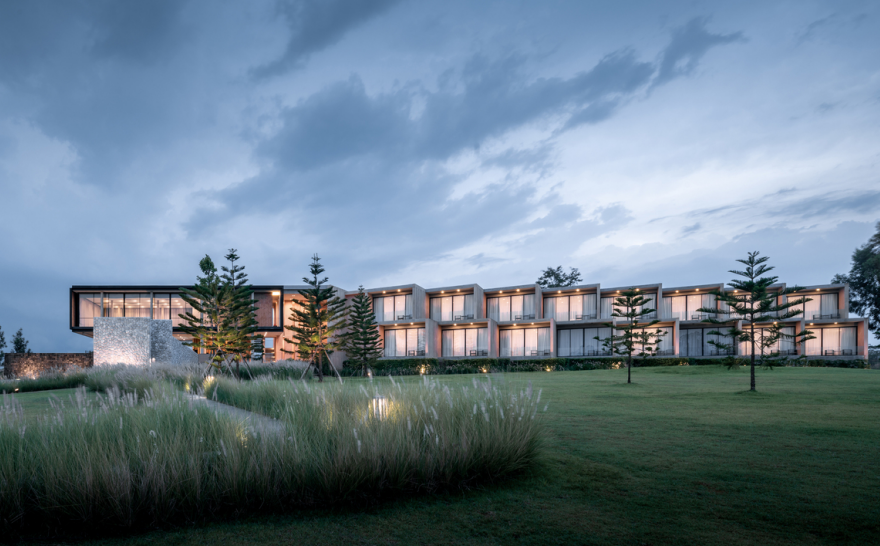 该度假区坐落于该区一山脊的巨大斜坡上,由绿荫与山脉环绕,充满自然气息。该项目的设计概念也因此在于强增强游客体验与场地文脉之间的联系。 为了实现这一概念,我们进行了从建筑规划到材料选择的一体化设计。该项目的布局旨在分散功能分区,以丰富游客的视觉层次。设计师首先将大堂定位于几乎看不见风景的场地最低处,随后通过小径将游客缓缓引导至主要功能区,如全日使用的餐厅以及游泳池等景点。壮丽的景观在上升过程中向游客徐徐展现。场地至高处矗立着客房楼。每个房间都自建筑物的轴线旋转45°,获得最大的视野。这也为每个房间创造了私密感,并形成了一个入口处的树木庭院。同样,创造庭院的的做法在别墅区也有应用。别墅中心有一个室外淋浴空间,游客身在其中仿佛能感受到该地雨季和冬季感著名的薄雾。