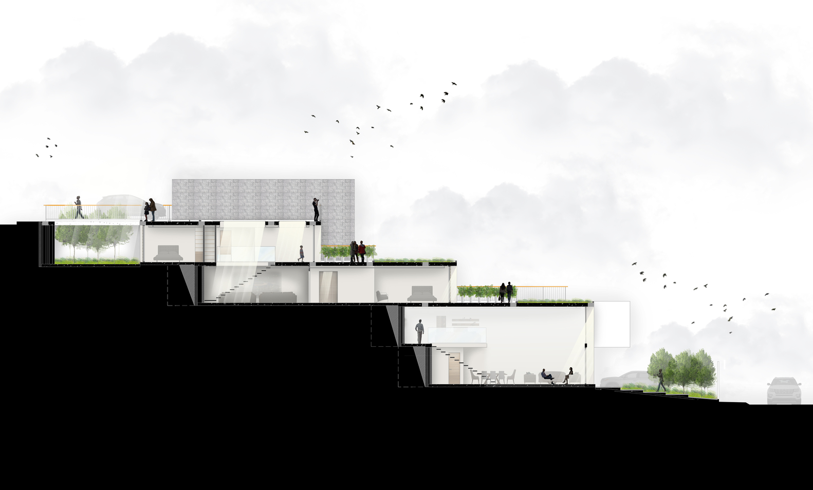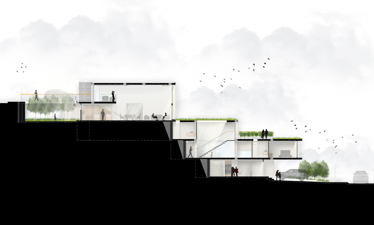 这个项目的概念源自于梯田地形变化。客户希望在这土地上能建一幢容纳4个300平米的旅游区建筑,在这个集合住宅项目的构想上要同时对剖面及平面土地上进行分析,对这组的建筑模块解读是从各种高度和深度位置产生不同层次的梯田绿地,每一个空间的入口正面都能看到绿地般的景色,在不同的梯田景观上都是与这个自然环境地域结合。每幢房子有三个不同比例的模块组合,根据空间内的活动和走动区域跟停车入口而处在不同层,从主模块的复式空间中公共活动、半公共活动夾层跟还有两个简单模块的私人空间组合打破了一般室内空间的单调性。当空间分配时,这些模块是透过主建筑循環延续的垂直核心方式取代其它模块。
