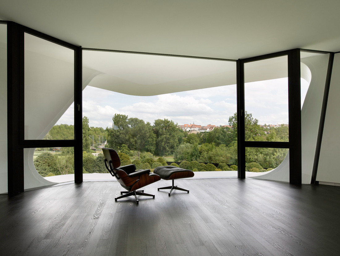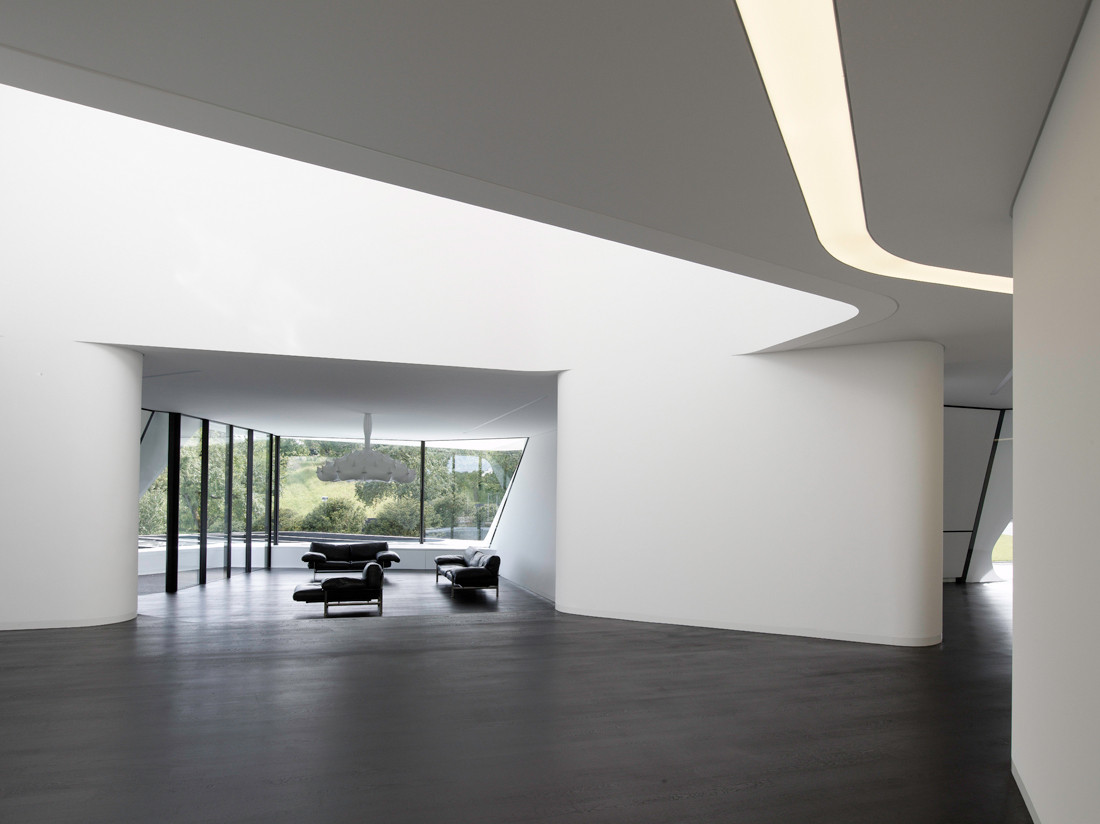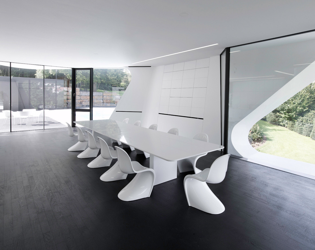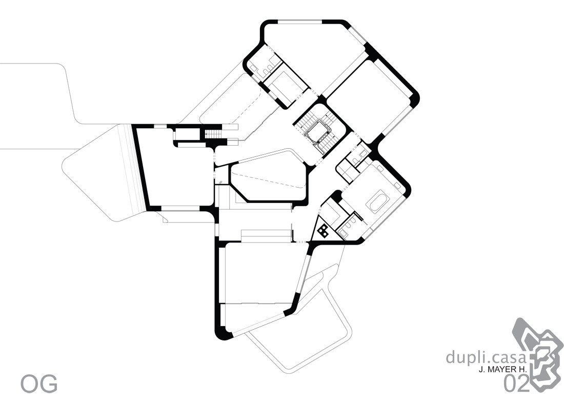 这一大楼被分为3个相同的棱柱段,每一个相互转了90度角。棱柱尺寸为43x43m,其形式主要由功能和美学决定。每个棱柱段包含四层,在中间垂直相交成一个中庭。因此,中庭的螺旋由此产生,在内部反映出外部的动态变化。