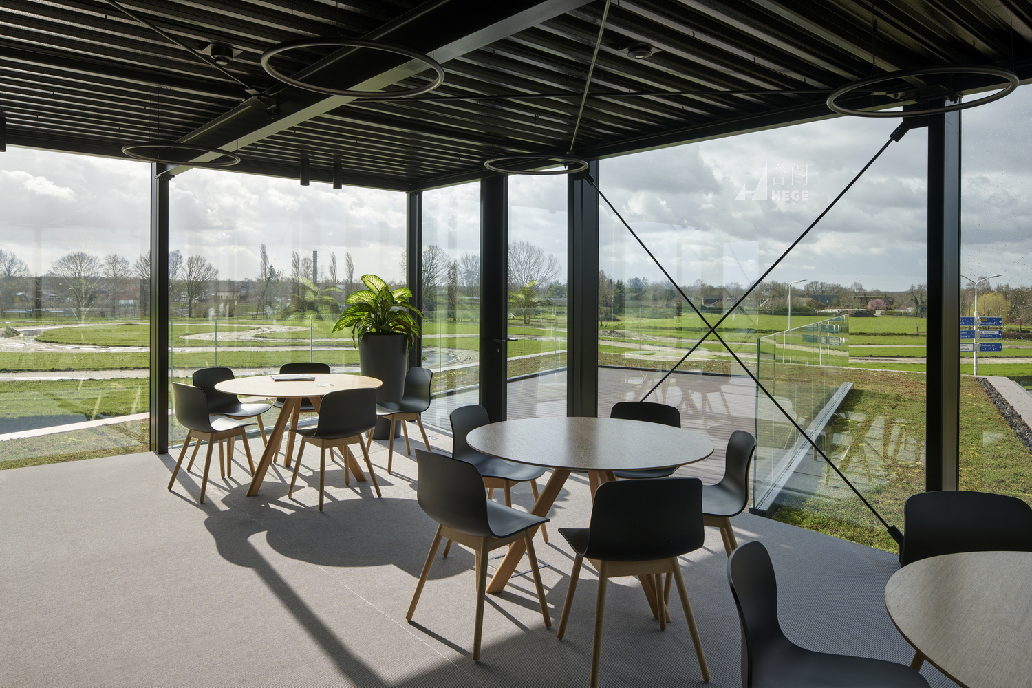 二楼,一个镜面盒子容纳了会议室和餐厅,相邻的室外空间位于草屋顶之间。
