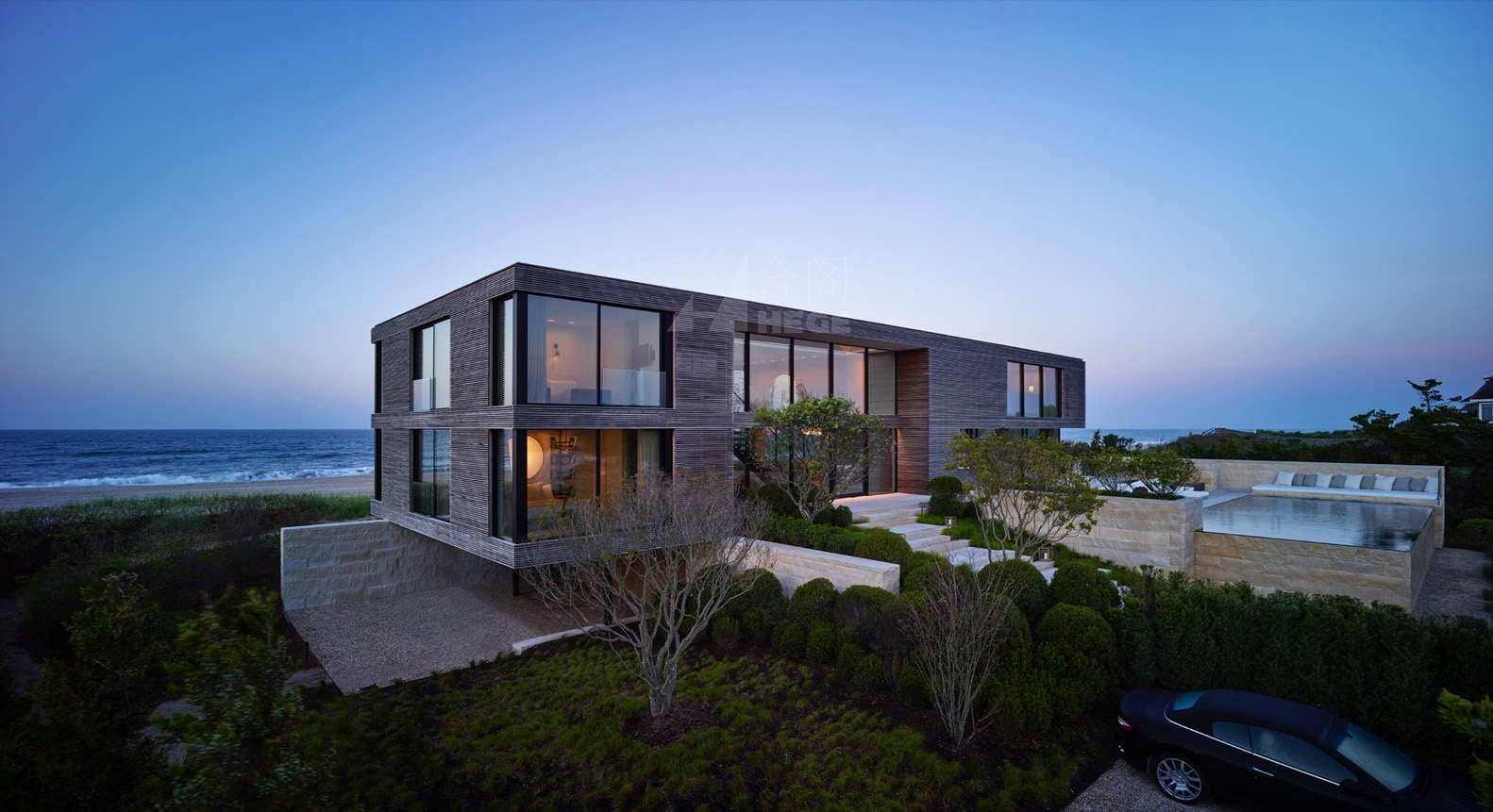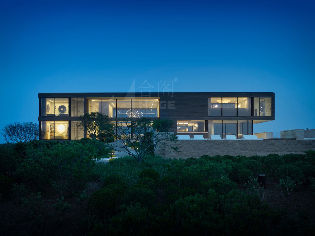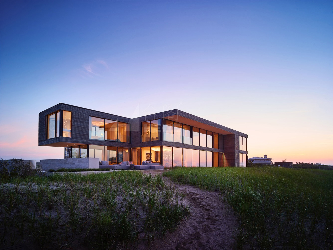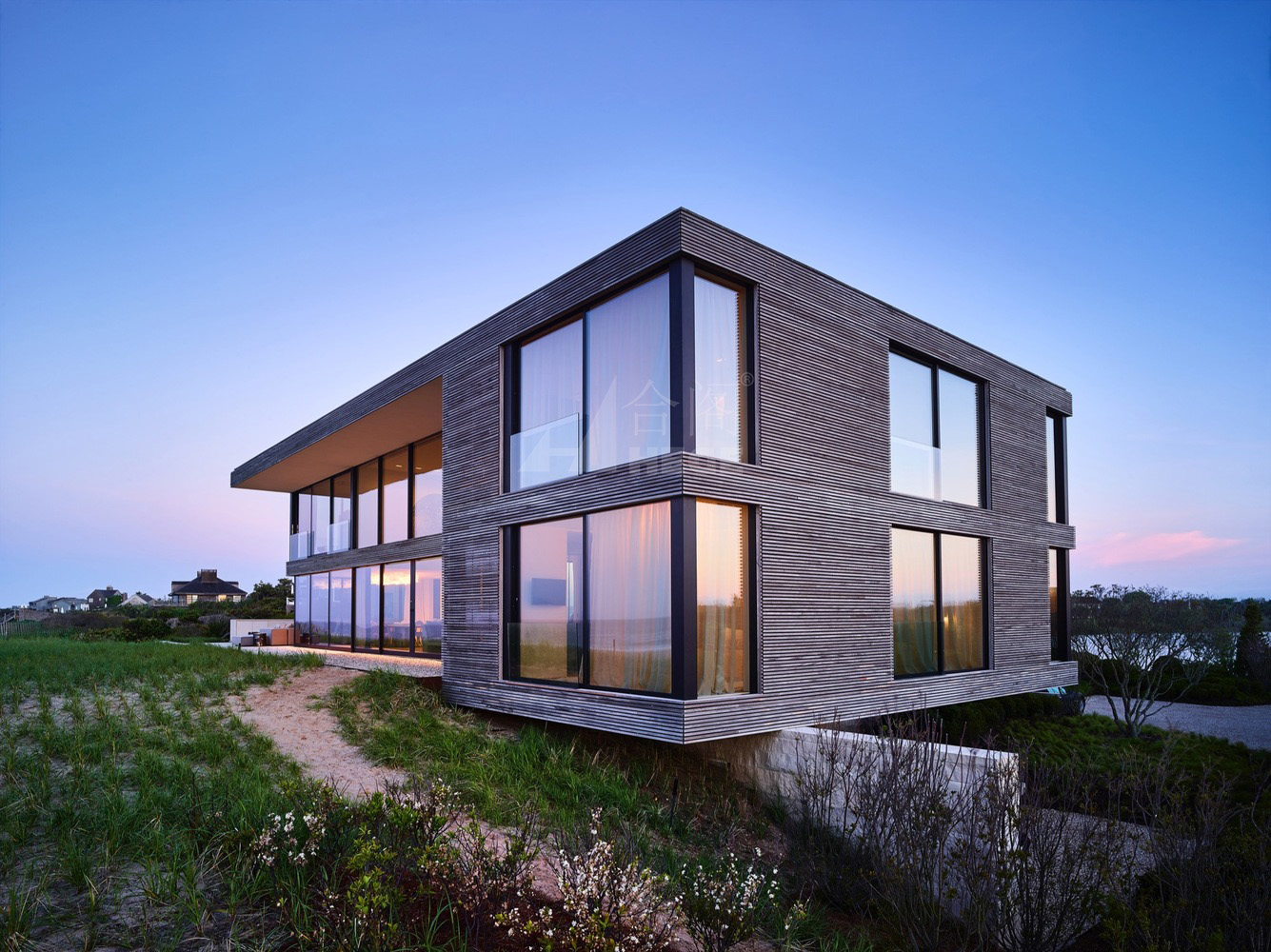 位于大海与池塘之间的景观居屋,似乎会被其周围的景观穿透。项目扮演的角色既是周围环境的延伸,又是一个庇护所,居住其中仿佛能感受到汹涌的水流与狂风的力量。房子建在桩上,采用钢框架结构。这所房子东翼的两层,是客人和家庭的卧室。每个房间都不大,从地板到玻璃天花板注重着与外部的联系,适当的遮挡使房间尽可能隔热。第二层楼板桥把孩子们的卧室和主人套房以及一个带有玻璃角落的起居室连接起来。