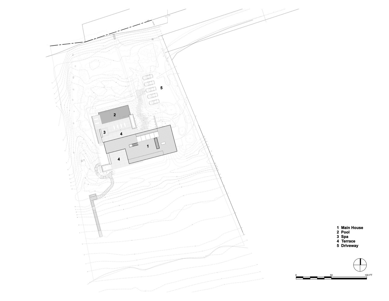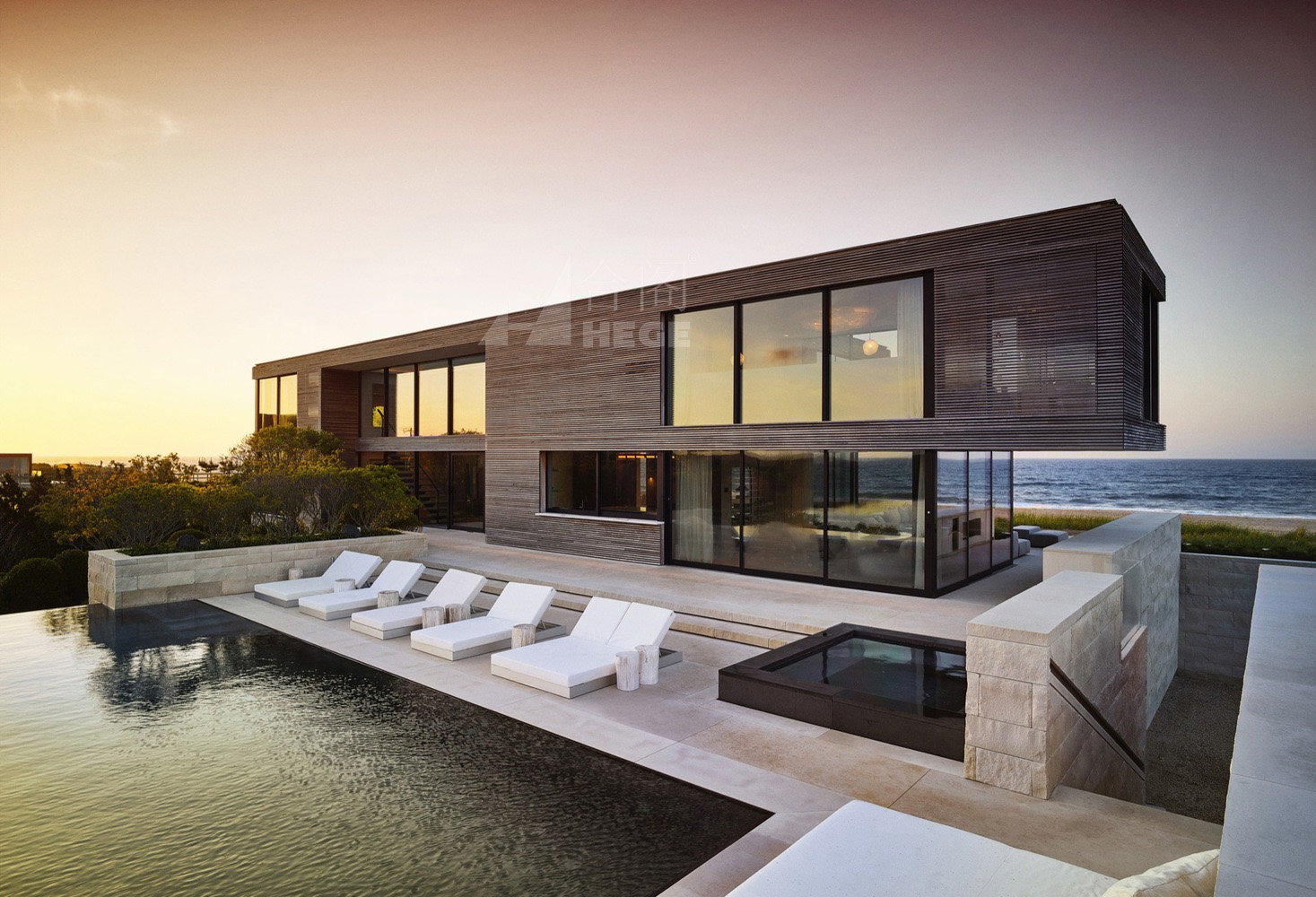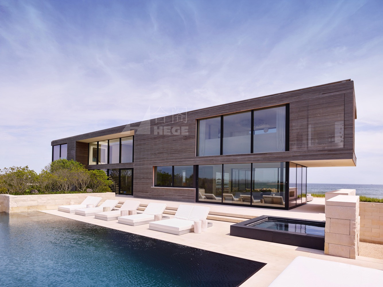 位于大海与池塘之间的景观居屋,似乎会被其周围的景观穿透。项目扮演的角色既是周围环境的延伸,又是一个庇护所,居住其中仿佛能感受到汹涌的水流与狂风的力量。房子建在桩上,采用钢框架结构。这所房子东翼的两层,是客人和家庭的卧室。每个房间都不大,从地板到玻璃天花板注重着与外部的联系,适当的遮挡使房间尽可能隔热。第二层楼板桥把孩子们的卧室和主人套房以及一个带有玻璃角落的起居室连接起来。