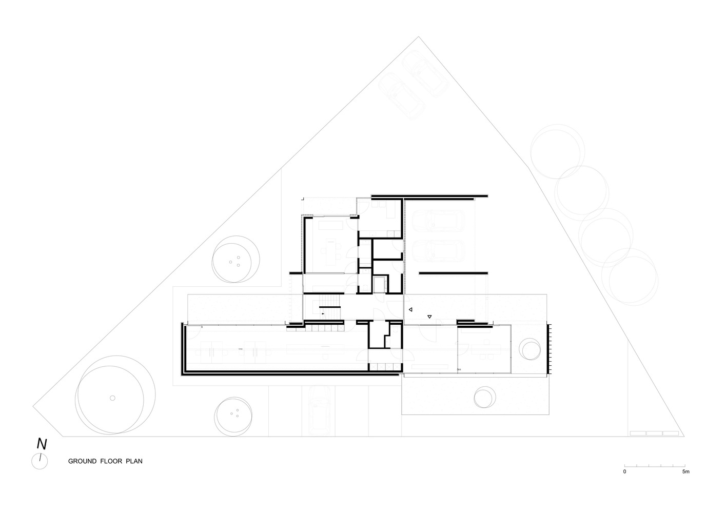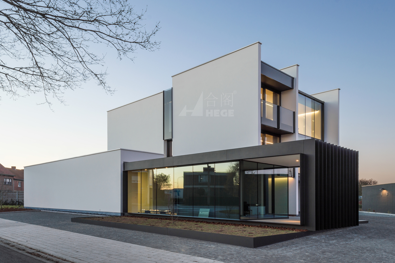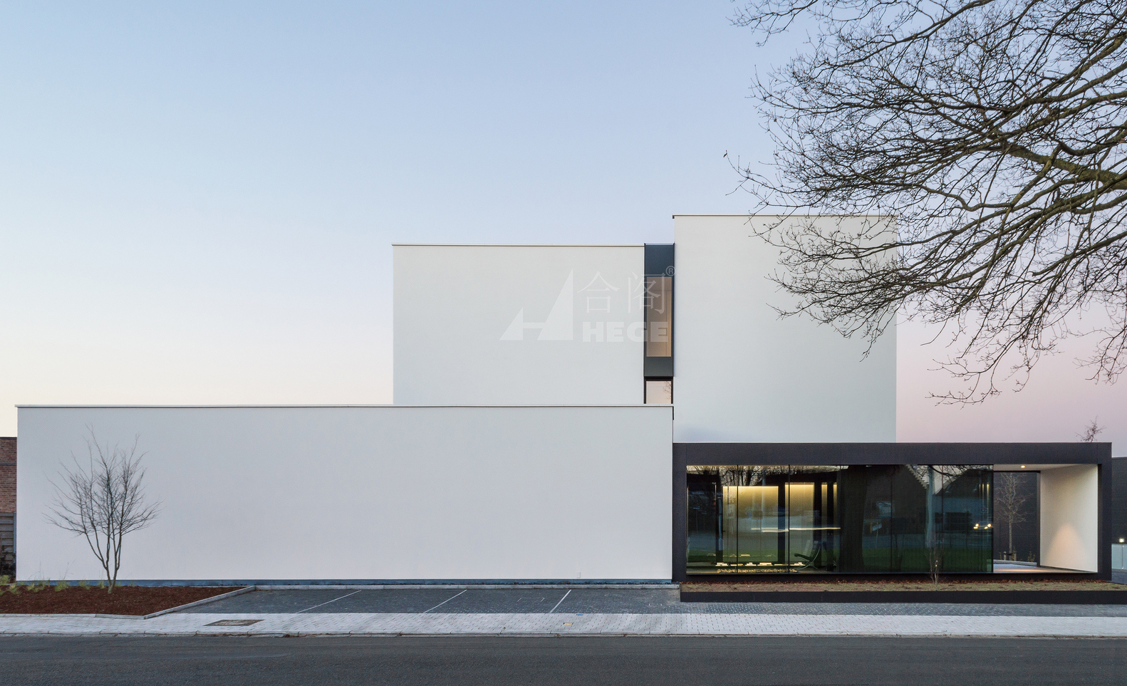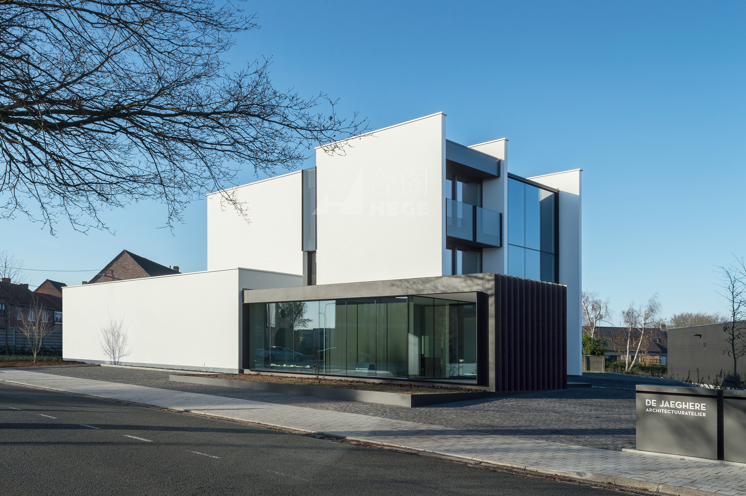 为了与十字路口和门口的高大橡树建立联系,建筑设计采用了动态的白色垂直表面,由玻璃和对比鲜明的金属分离开来。由于项目倾斜的外形,从十字路口对面看过来,建筑如同环绕着橡树,这个设计加强了建筑的动态效果。刻意添加的垂直表面令三角地块剩余的空间成为了建筑内部的延伸区域,在功能上作为露台或是开放的公共区域。
