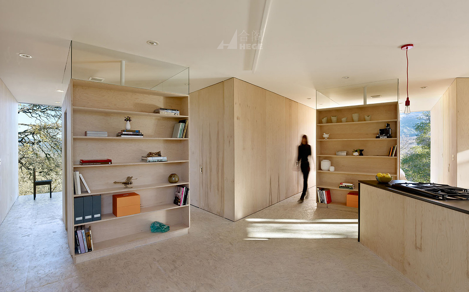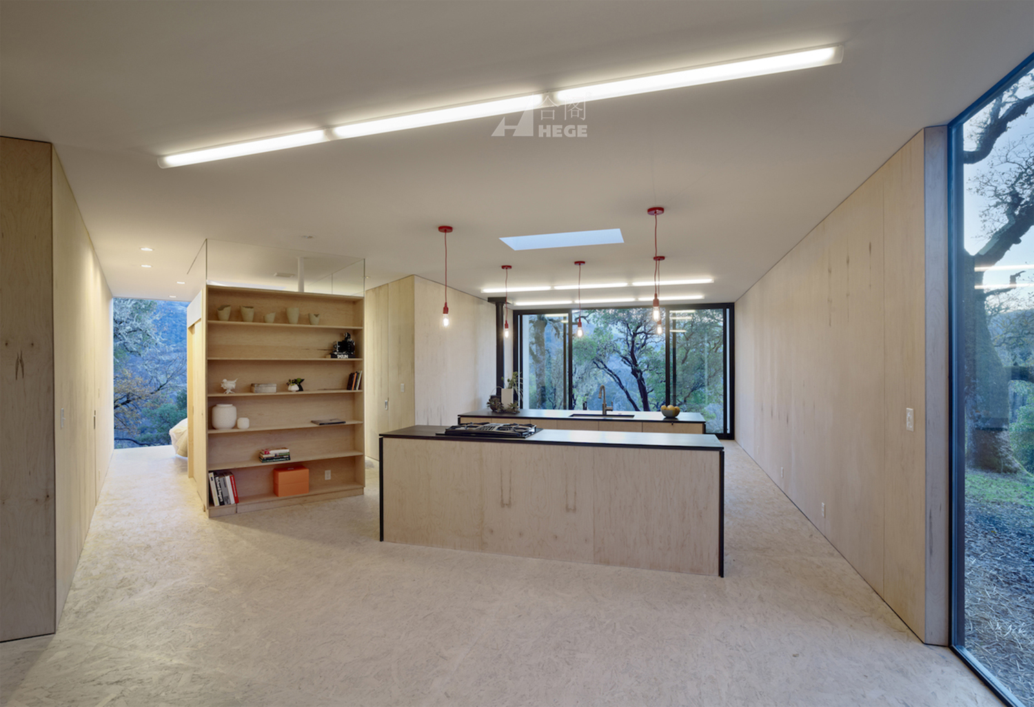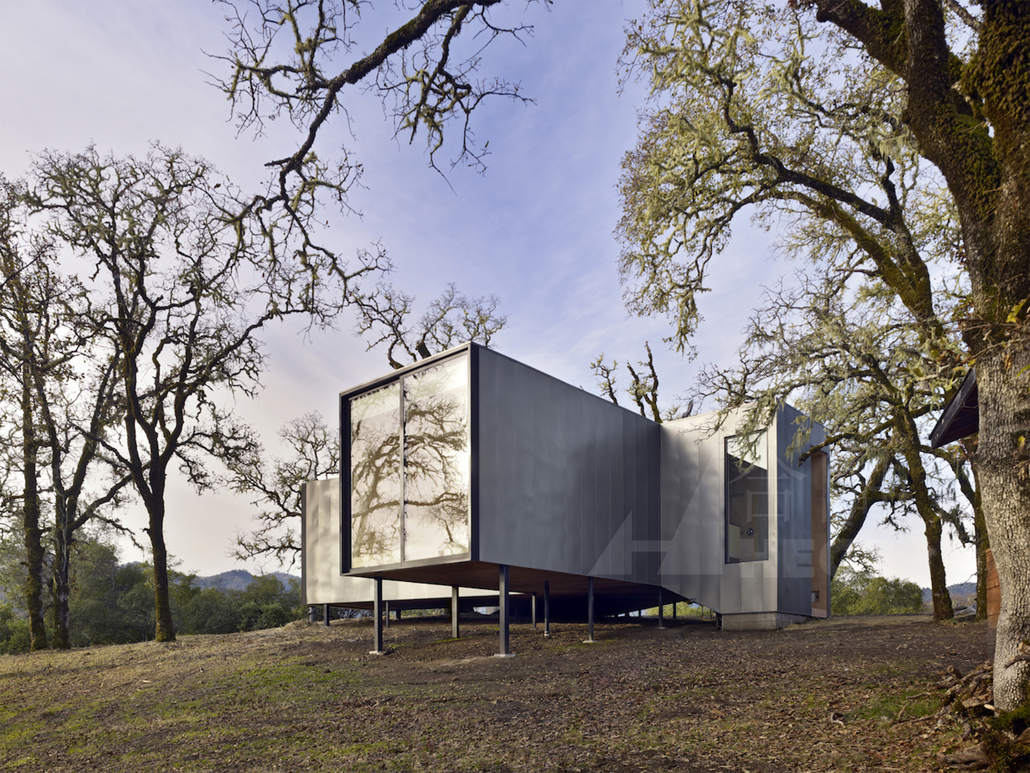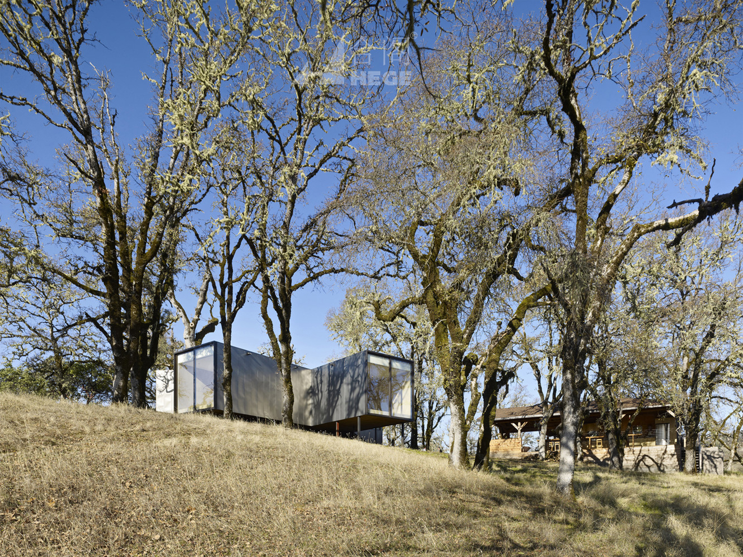 从这个项目的场地可以看到三个当地已知的地形:“鹰岩”,一个山脊,以及下面的葡萄园山谷。主要的挑战是构建这三个独立的视图,同时保留现场现有的每棵橡树。三个手指精确地在现有的树木之间延伸,每一个指向一个陆地。为了避免切断树根,房子建在钢支柱上,同时满足客户的可持续发展目标,建筑采用标准尺寸的现成板材来最大限度地减少浪费。