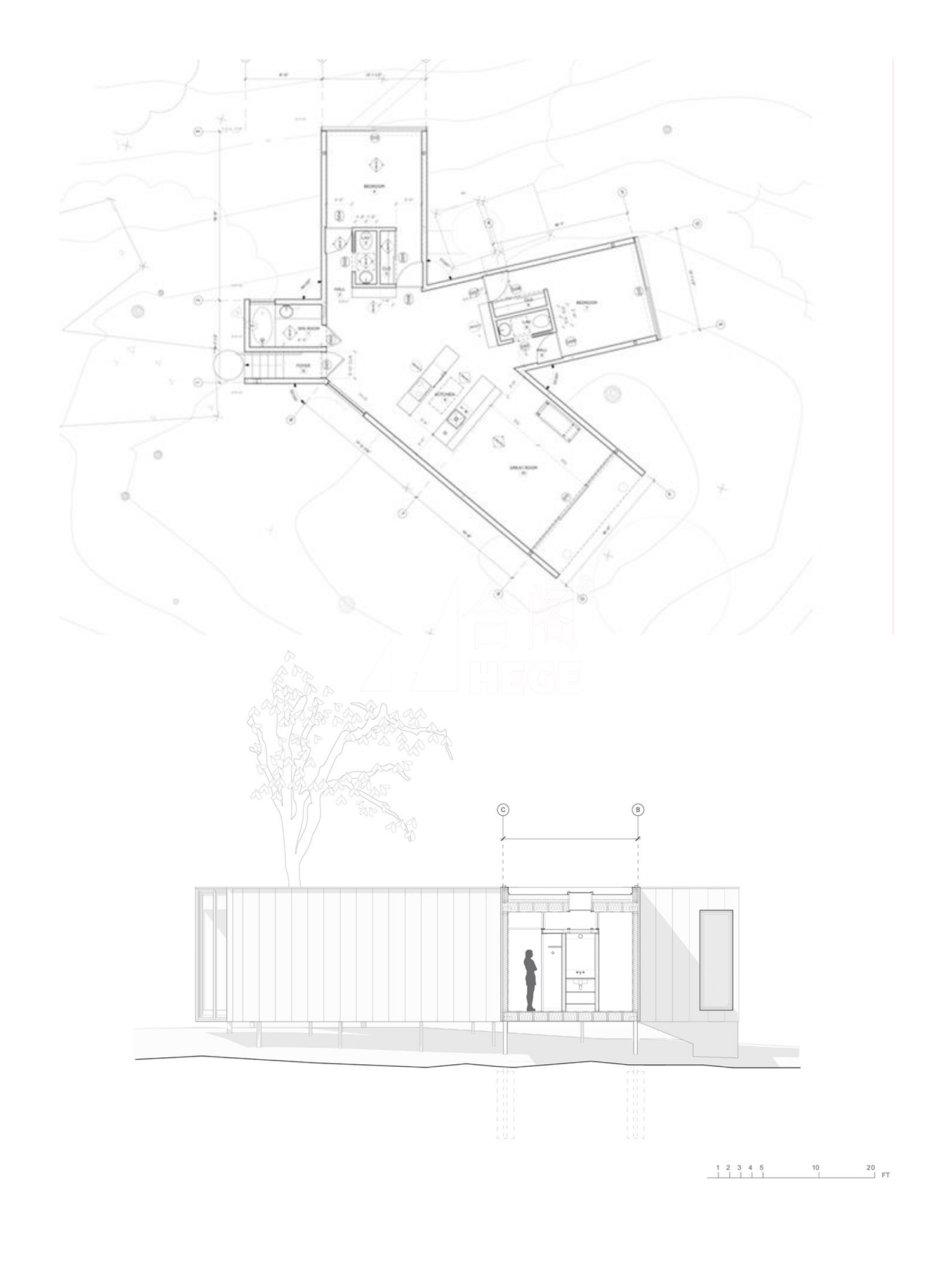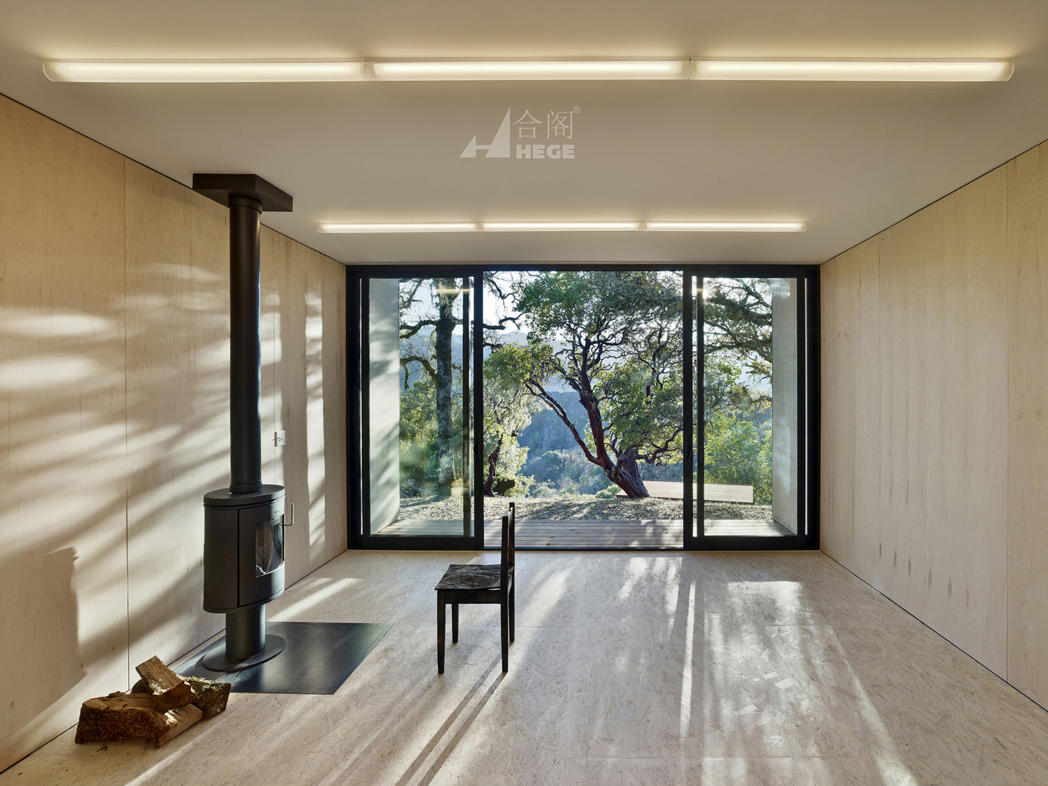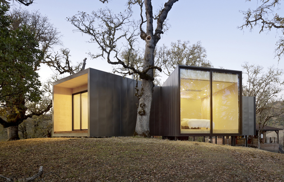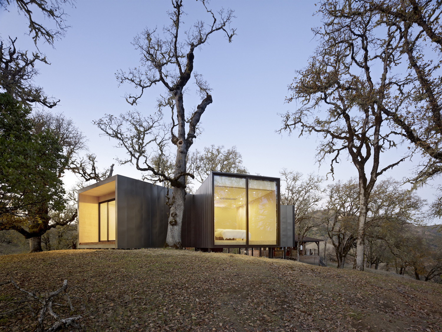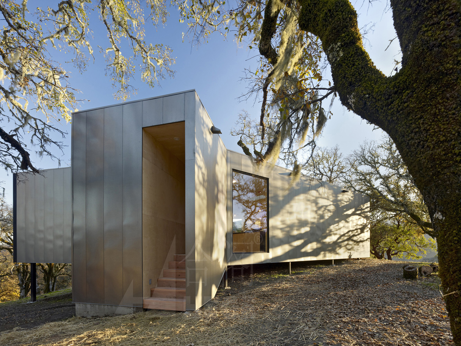 从这个项目的场地可以看到三个当地已知的地形:“鹰岩”,一个山脊,以及下面的葡萄园山谷。主要的挑战是构建这三个独立的视图,同时保留现场现有的每棵橡树。三个手指精确地在现有的树木之间延伸,每一个指向一个陆地。为了避免切断树根,房子建在钢支柱上,同时满足客户的可持续发展目标,建筑采用标准尺寸的现成板材来最大限度地减少浪费。