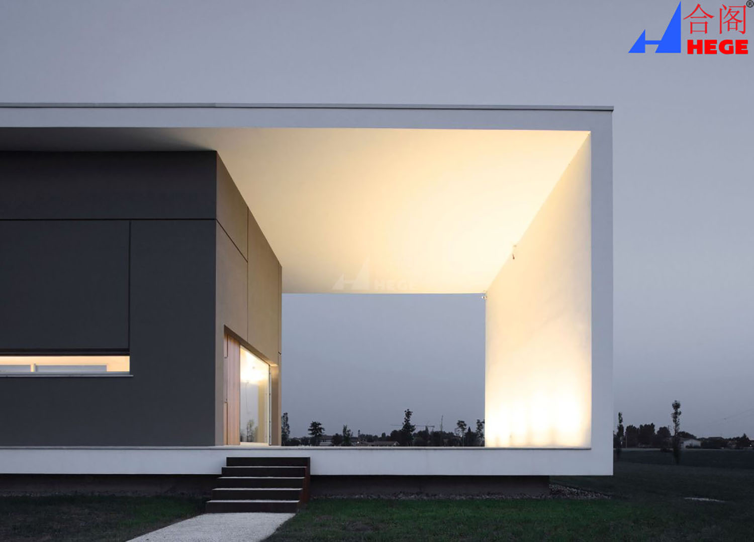 巨大的门廊也明晰了房子和乡村之间的界限。“独立的物件",如楼梯和有着同样的形式和具象性的斜坡,代表了公路和小道的自然延伸。