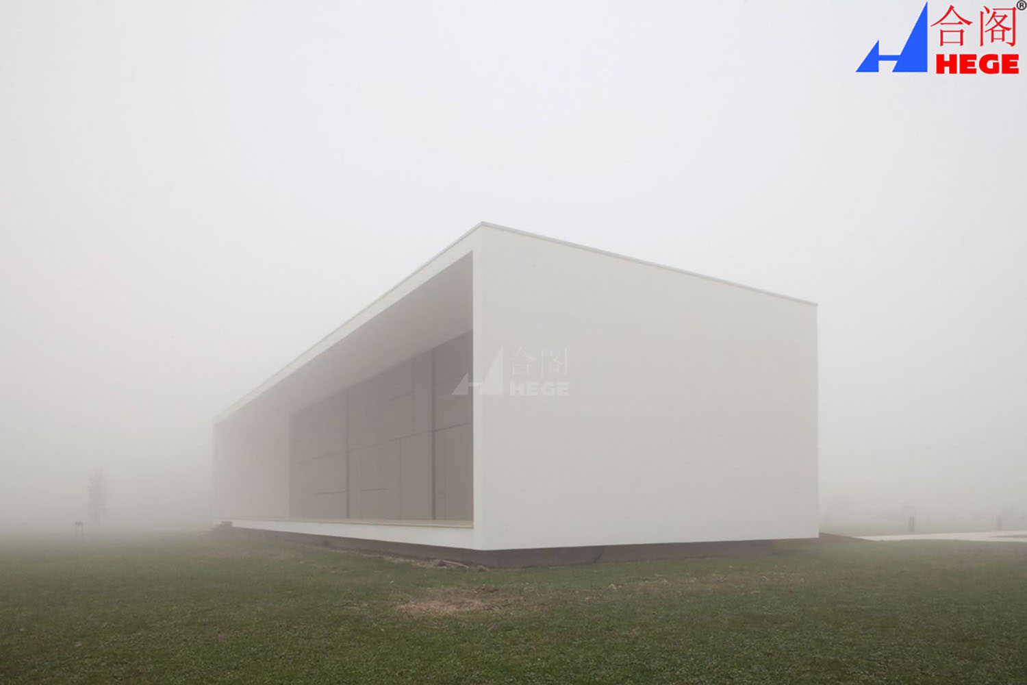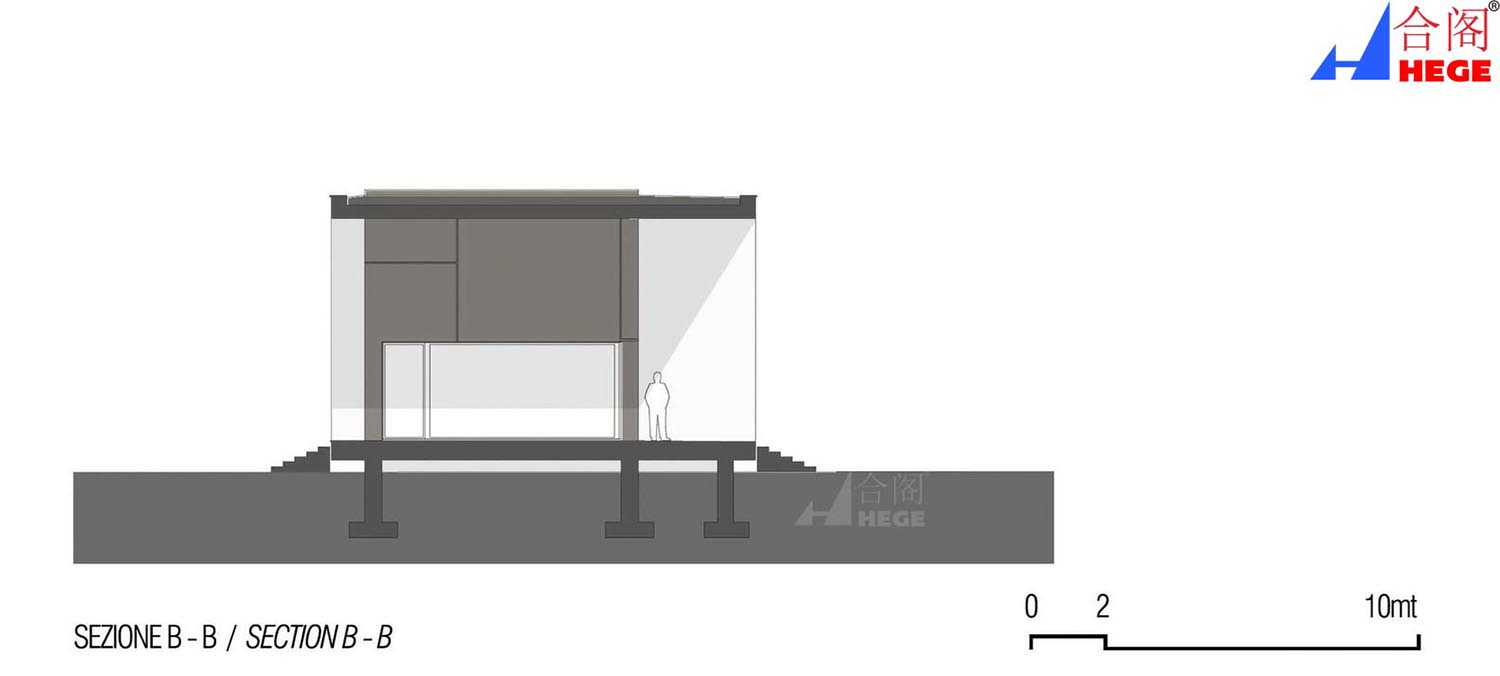 这个住宅的东北向由两个错列的部分构成,即门廊或气候缓解剂和住宅空间或绝缘体。它处于乡村景观和游客之间,到道路60米的距离。地板被抬高悬空于地面,来保护表面天气的高层并存储绝缘层的“氨土”。